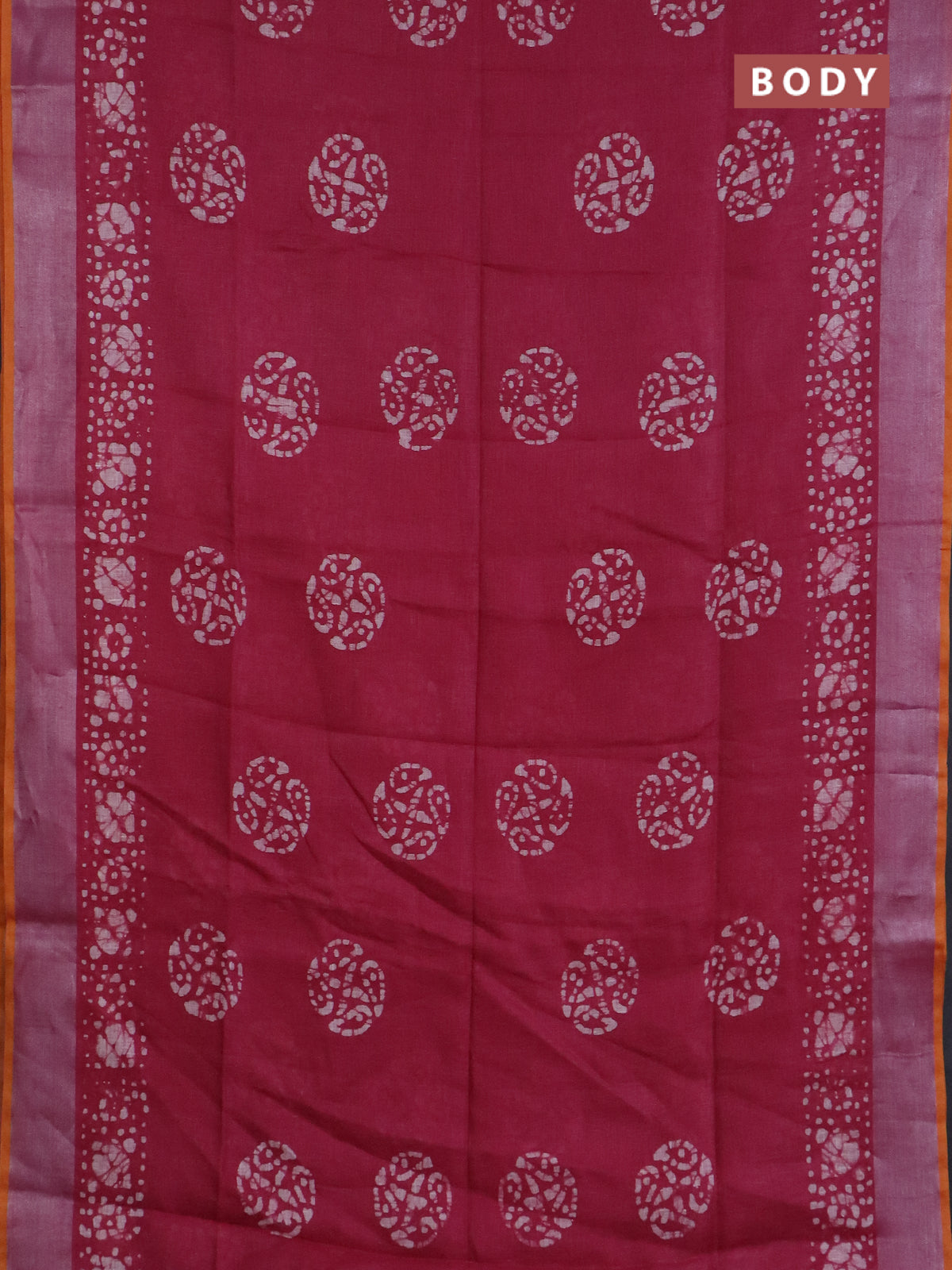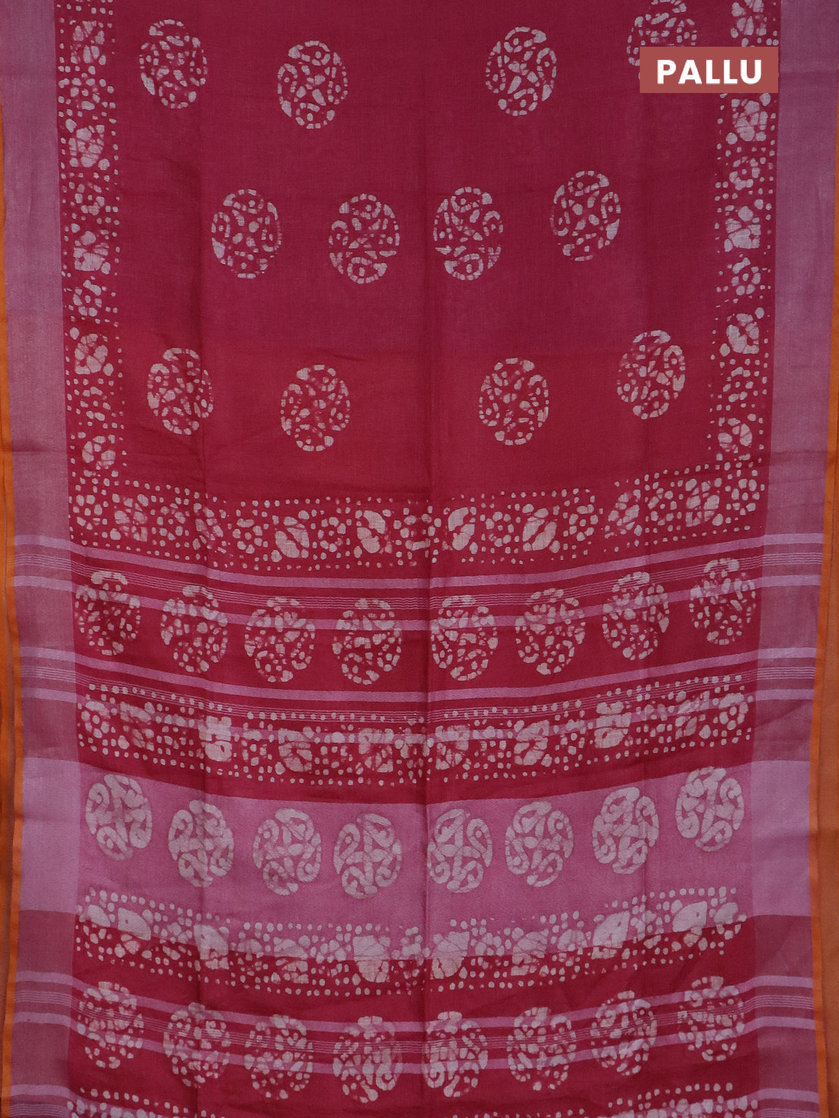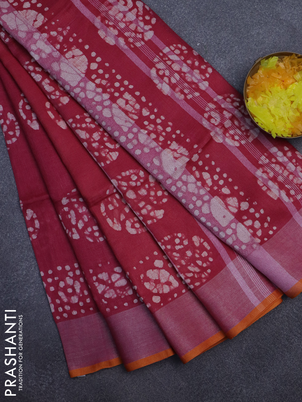 Pure linen saree dark pink and yellow with batik butta prints and silver zari woven border