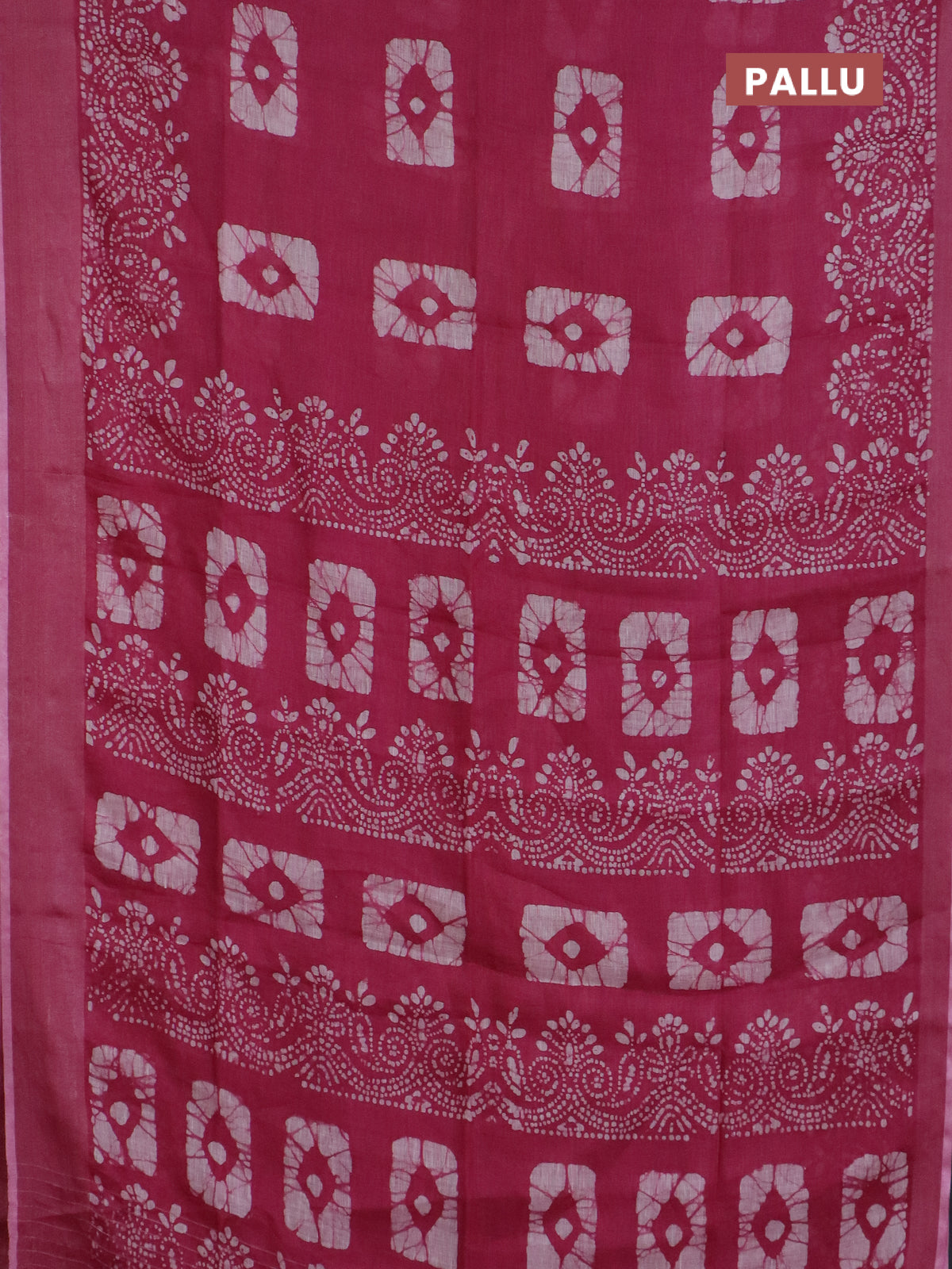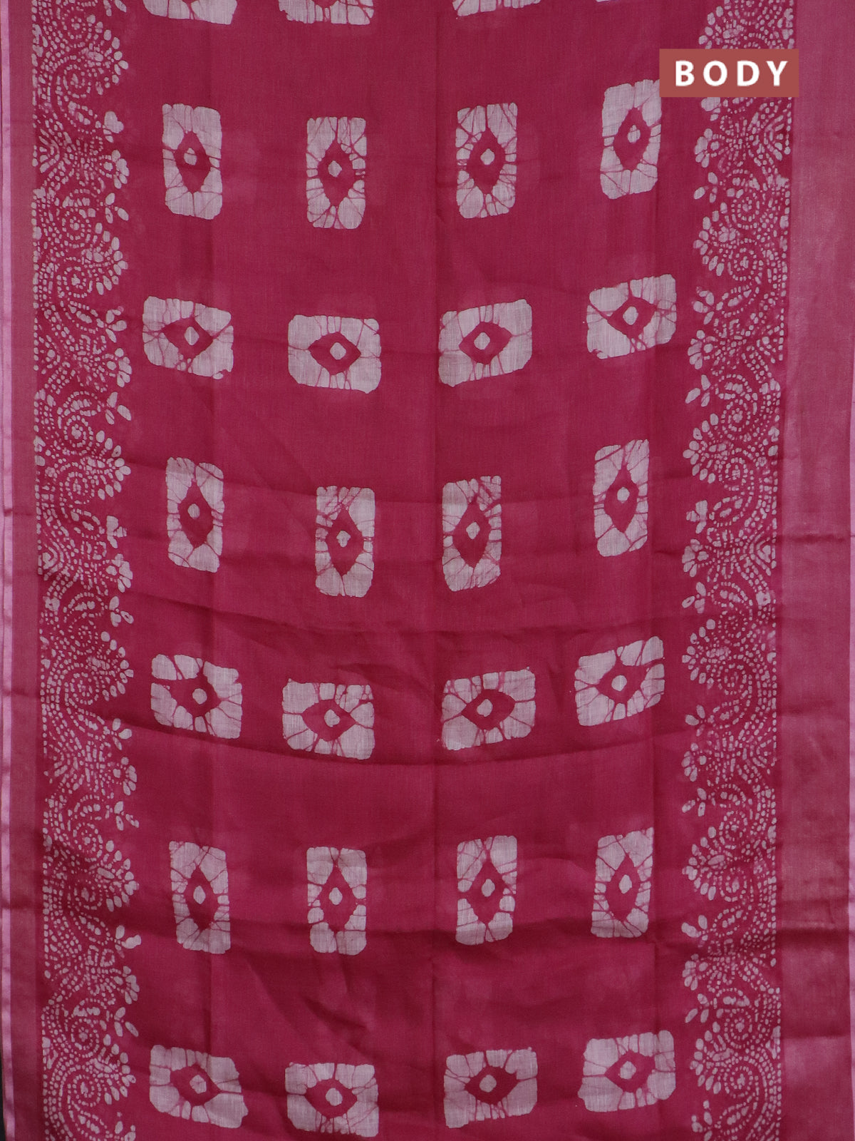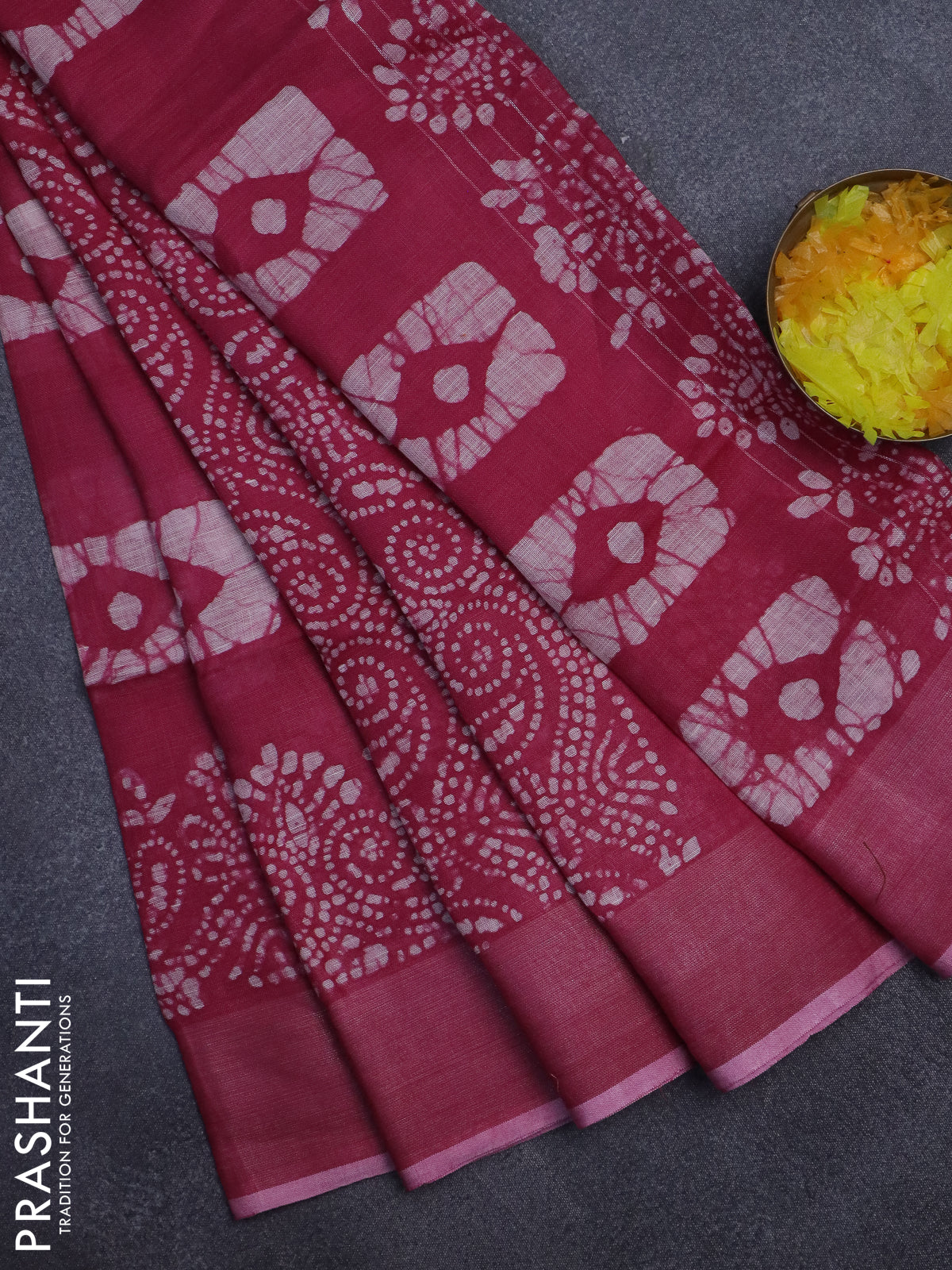 Pure linen saree dark pink with allover batik prints and zari woven border