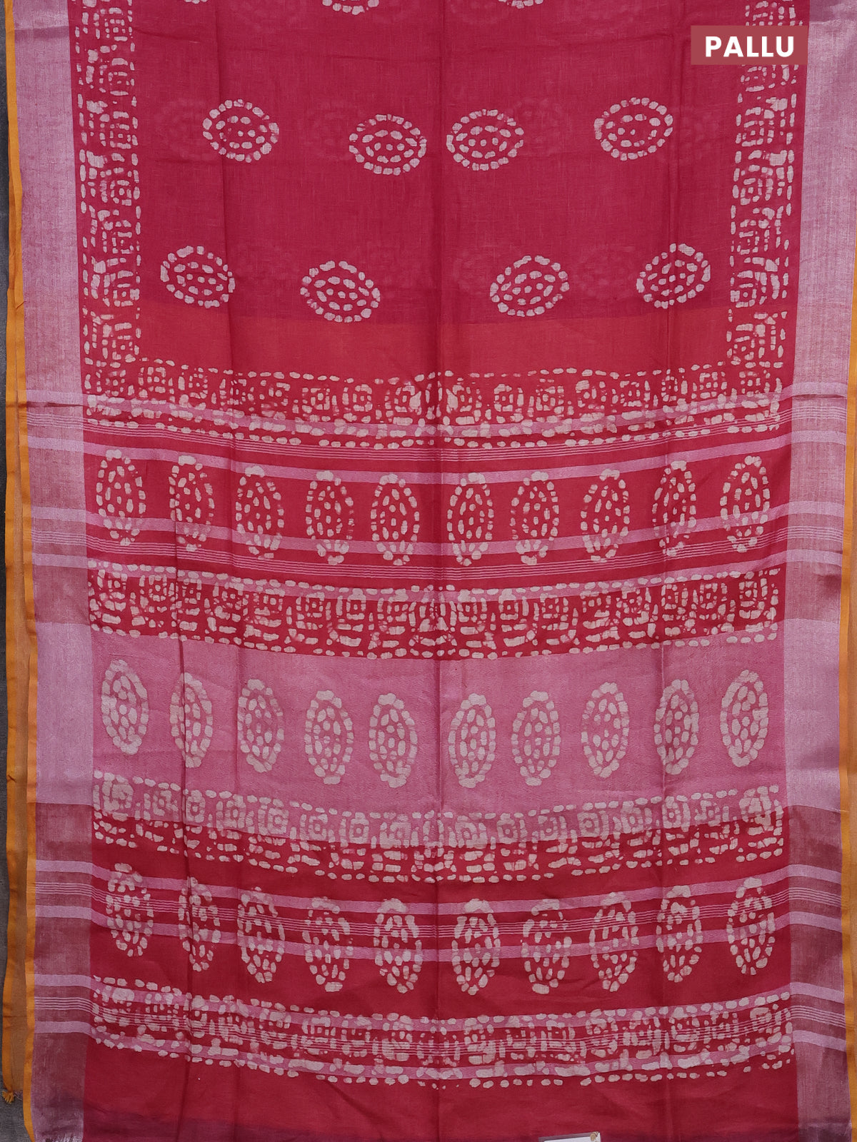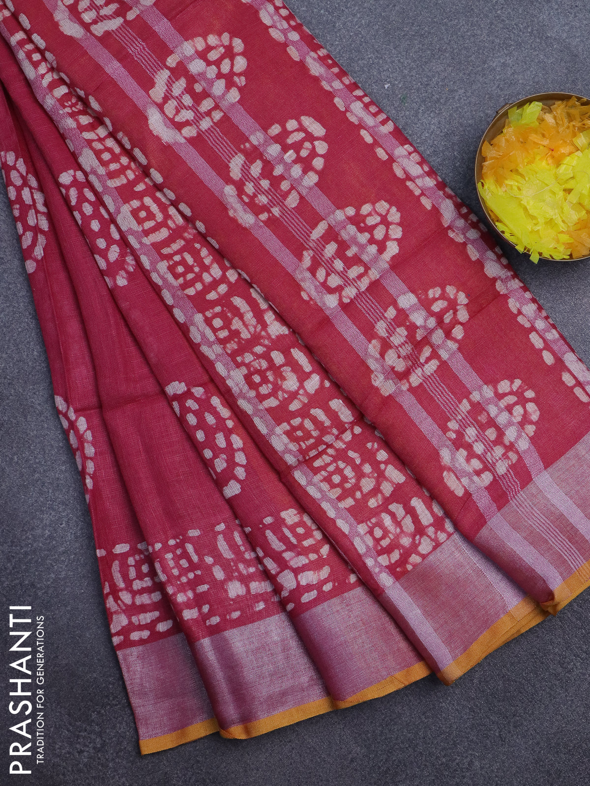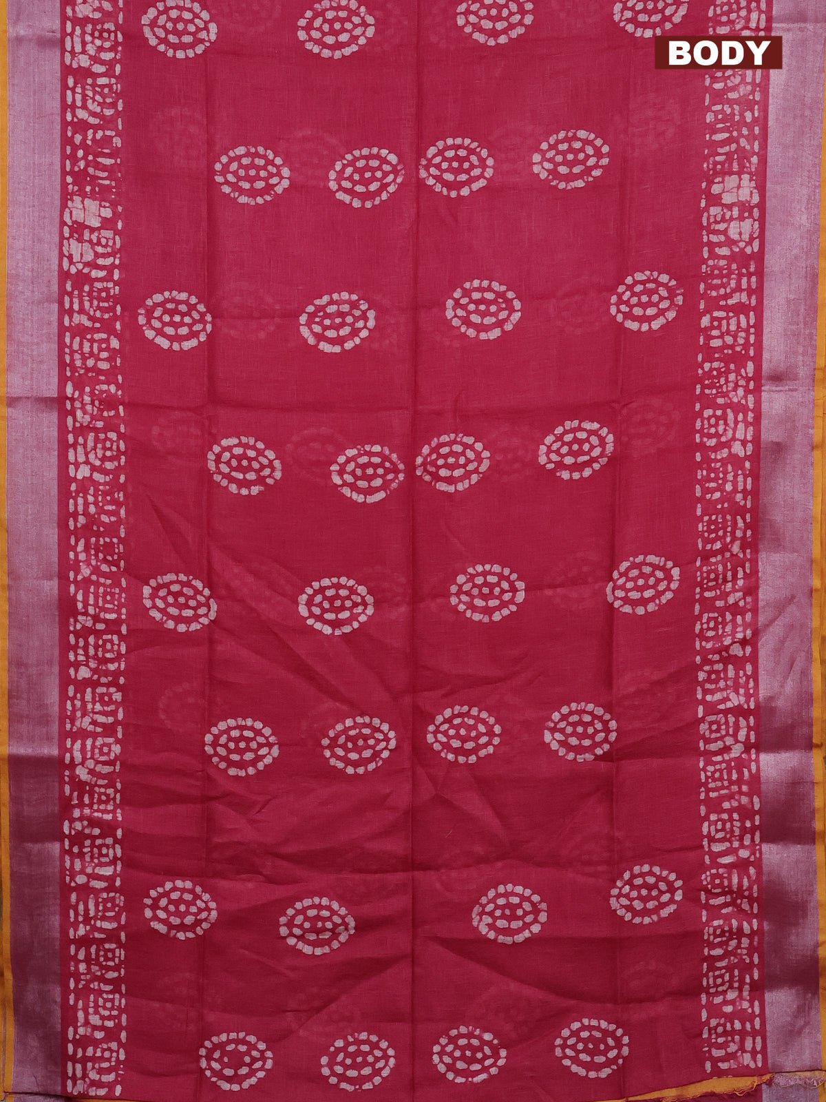 Pure linen saree dark pink with batik prints and silver zari woven border