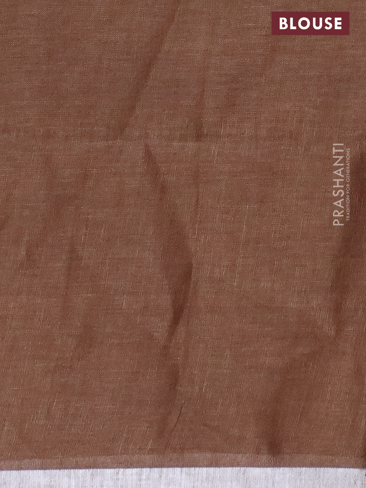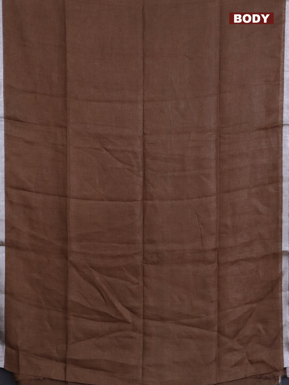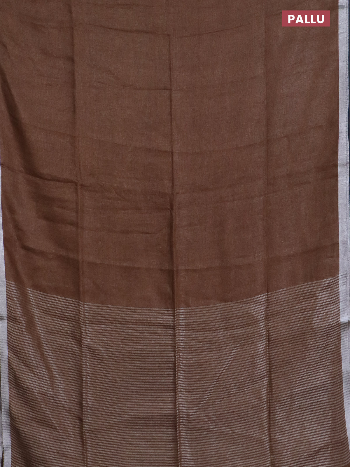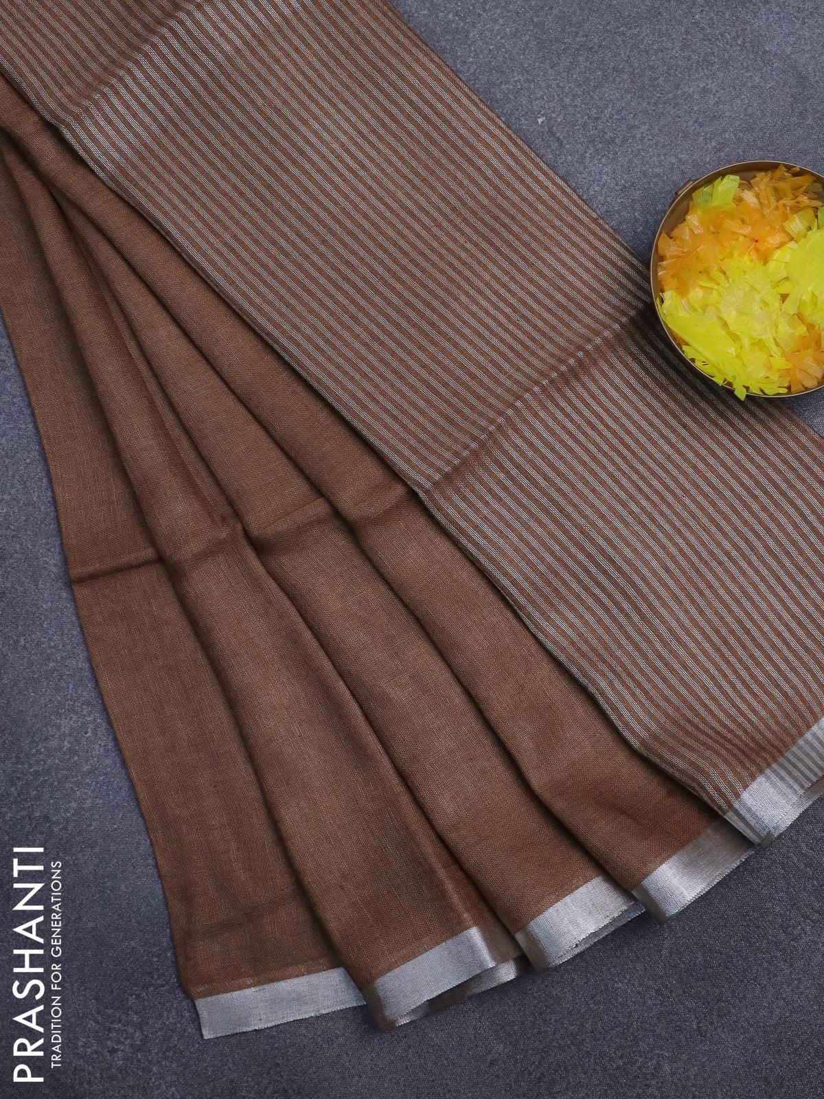 Pure linen saree dark sandal with plain body and silver zari woven border