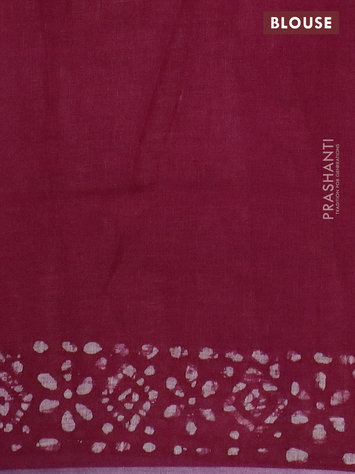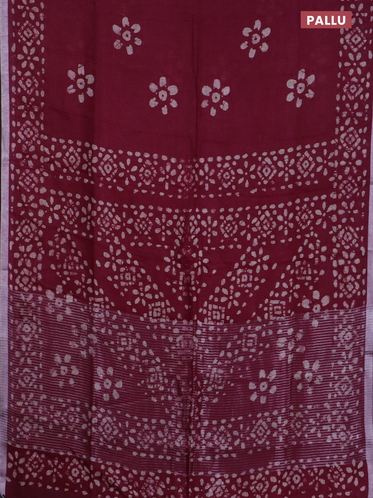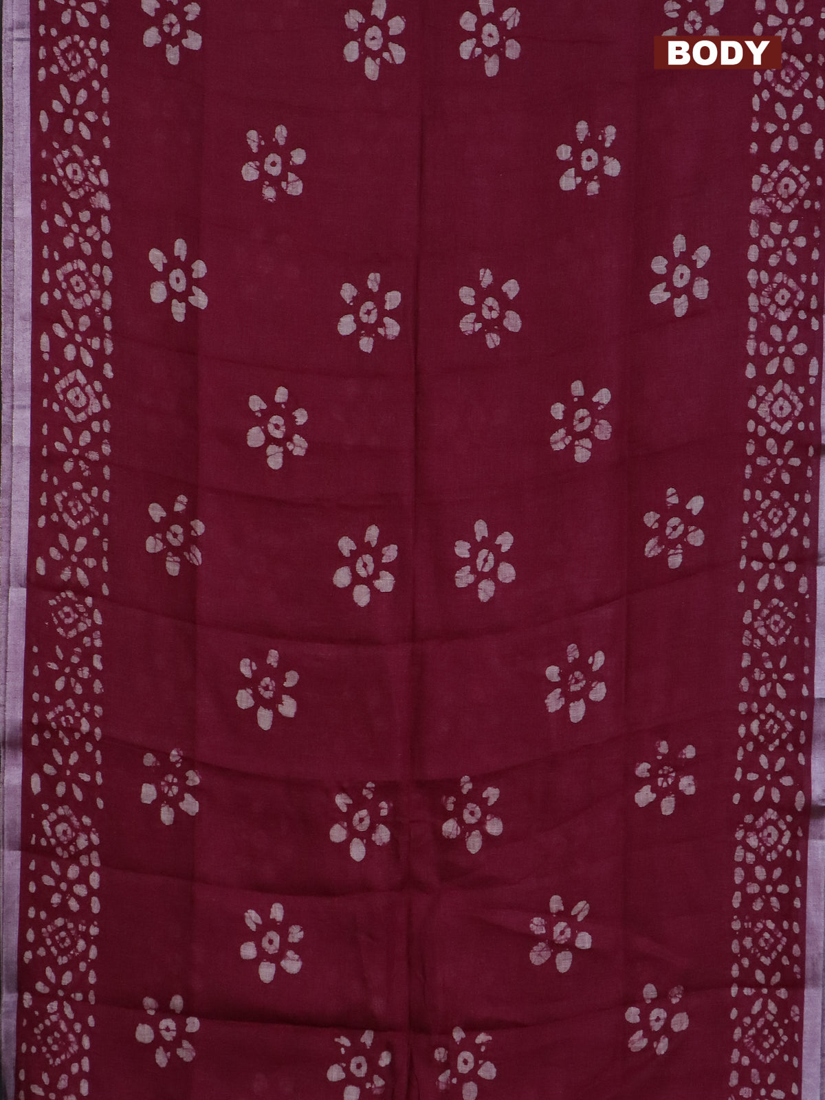 Pure linen saree deep maroon with batik butta prints and silver zari woven border