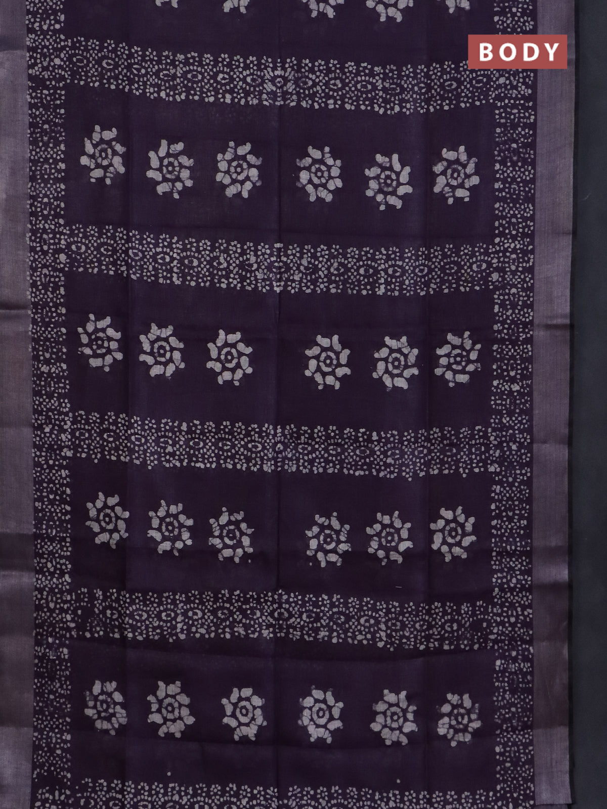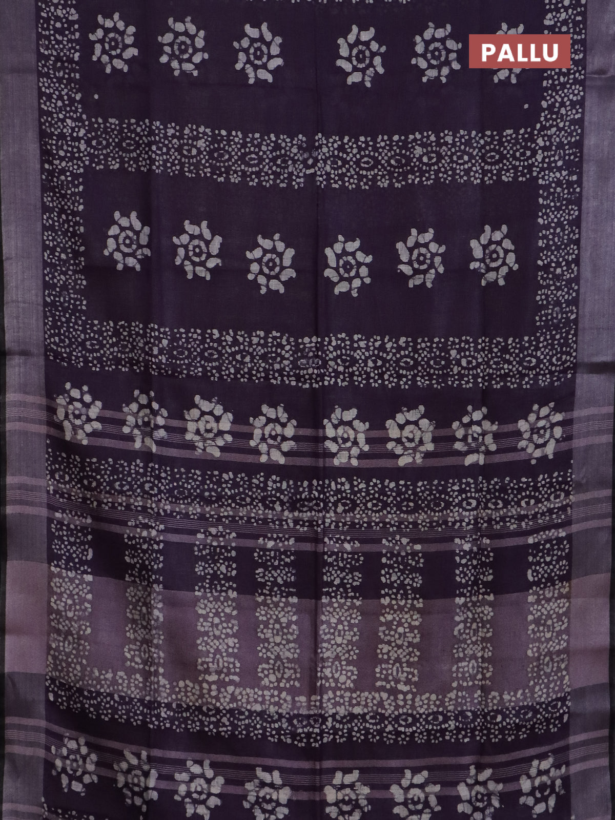 Pure linen saree deep violet and black with allover batik prints and silver zari woven border