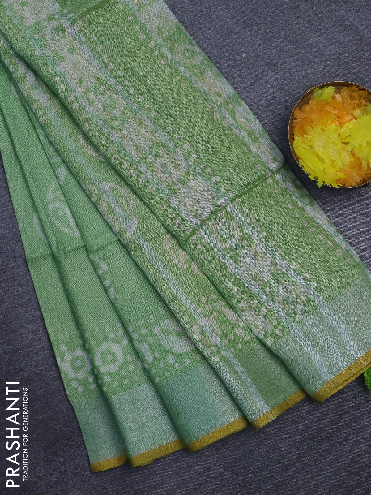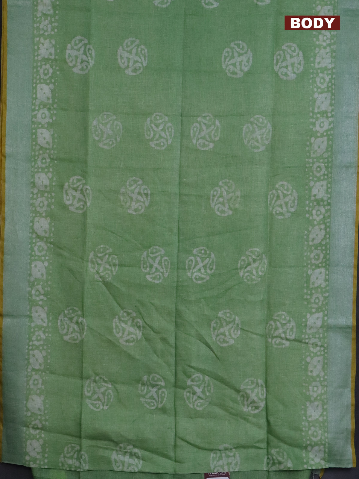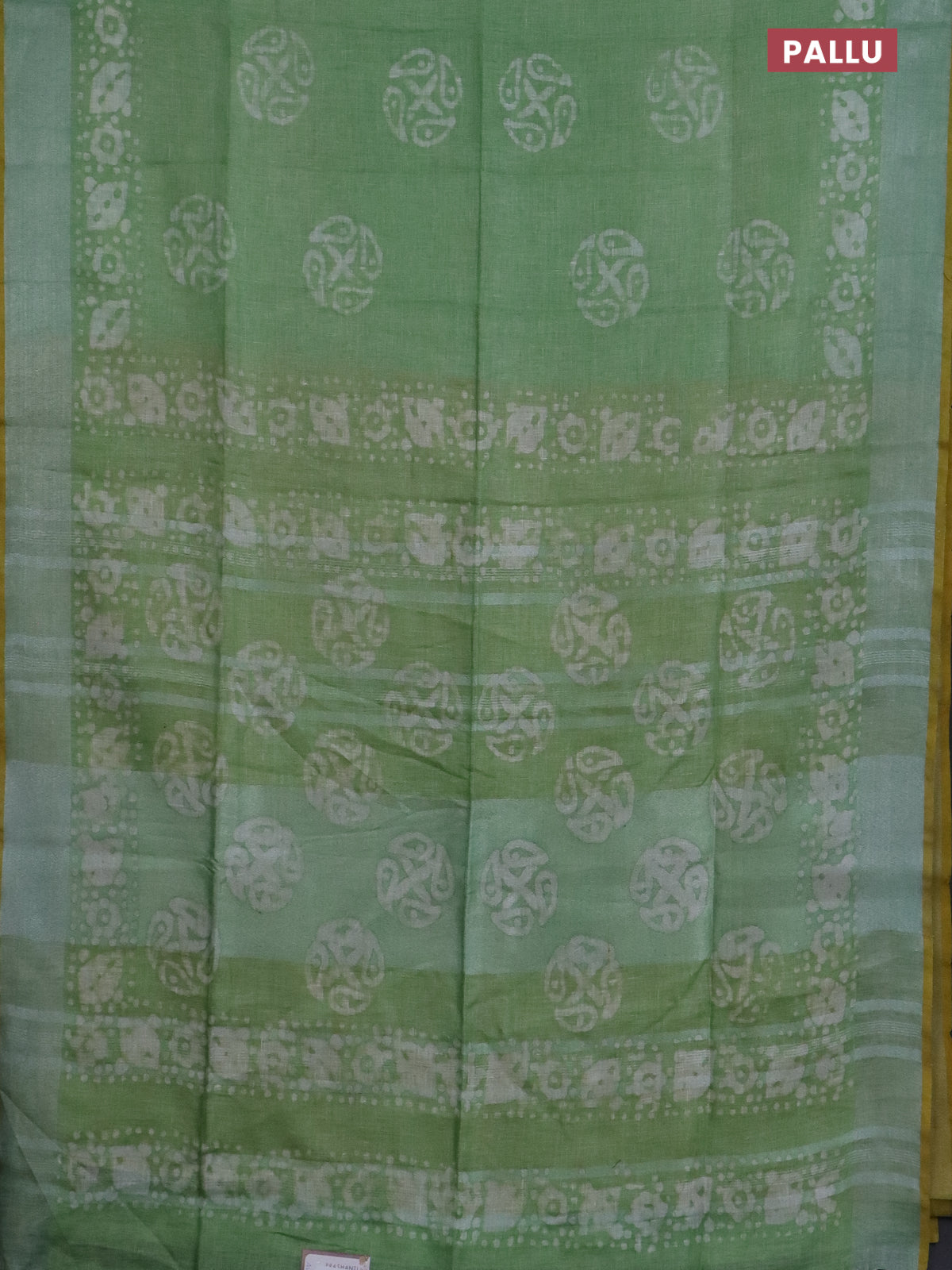Pure linen saree green shade and yellow with batik butta prints and silver zari woven border