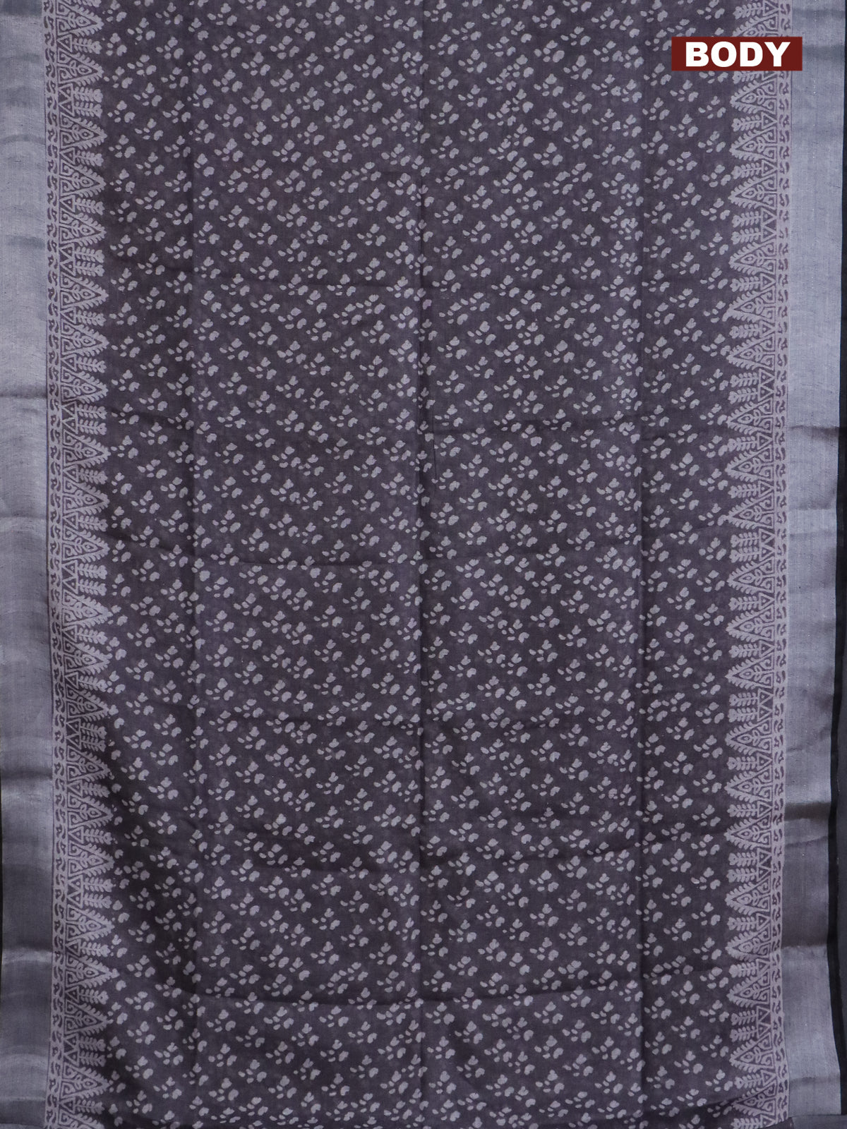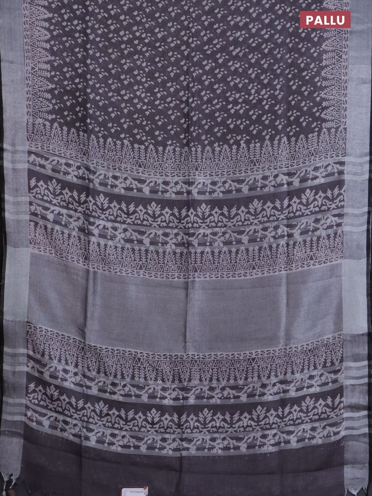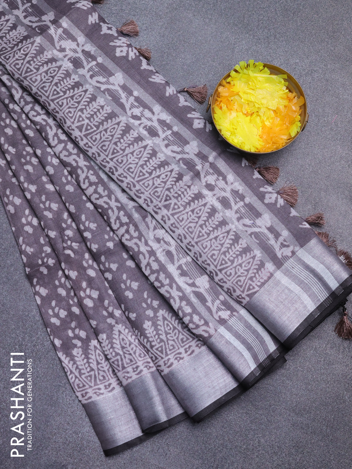 Pure linen saree grey and black with allover prints and silver zari woven border