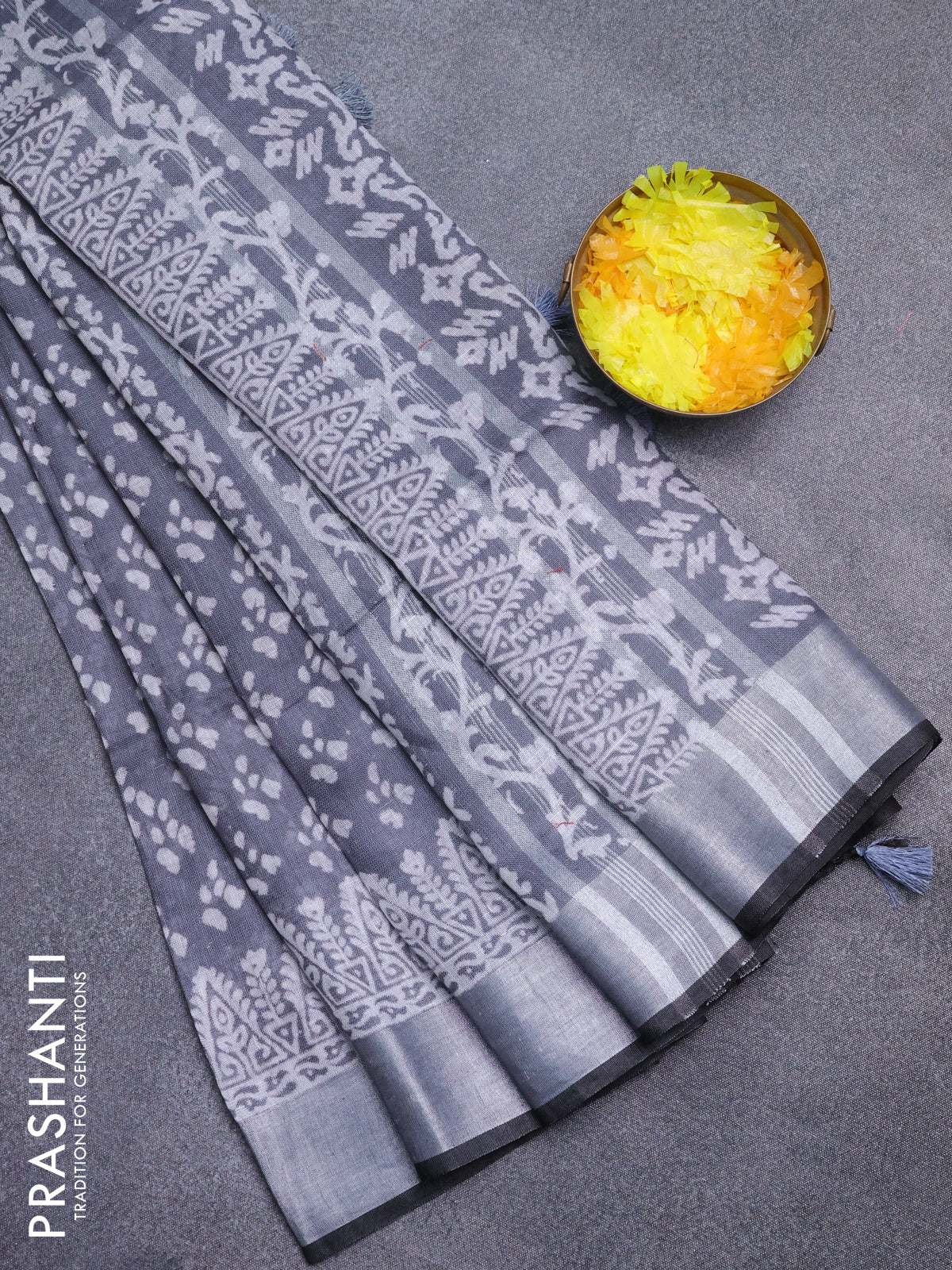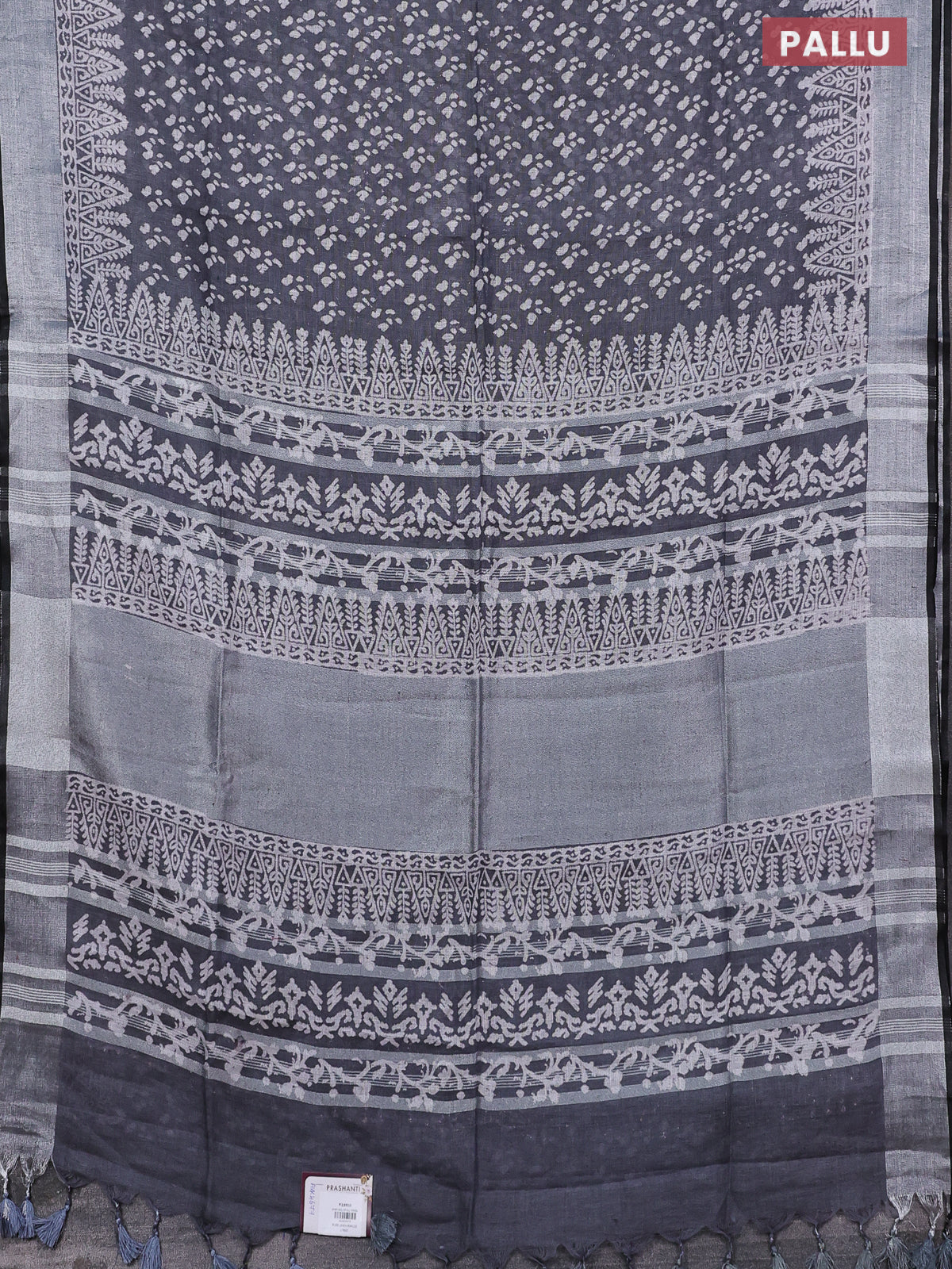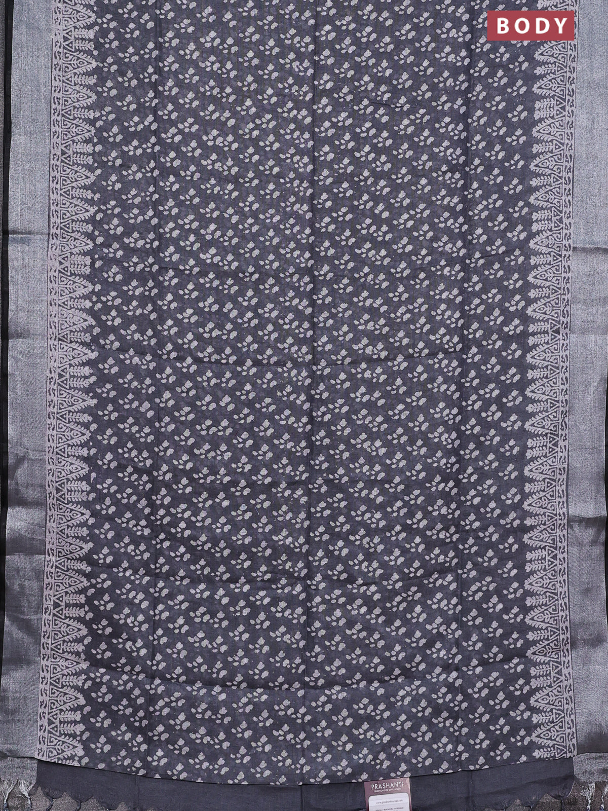 Pure linen saree grey and black with allover prints and silver zari woven border