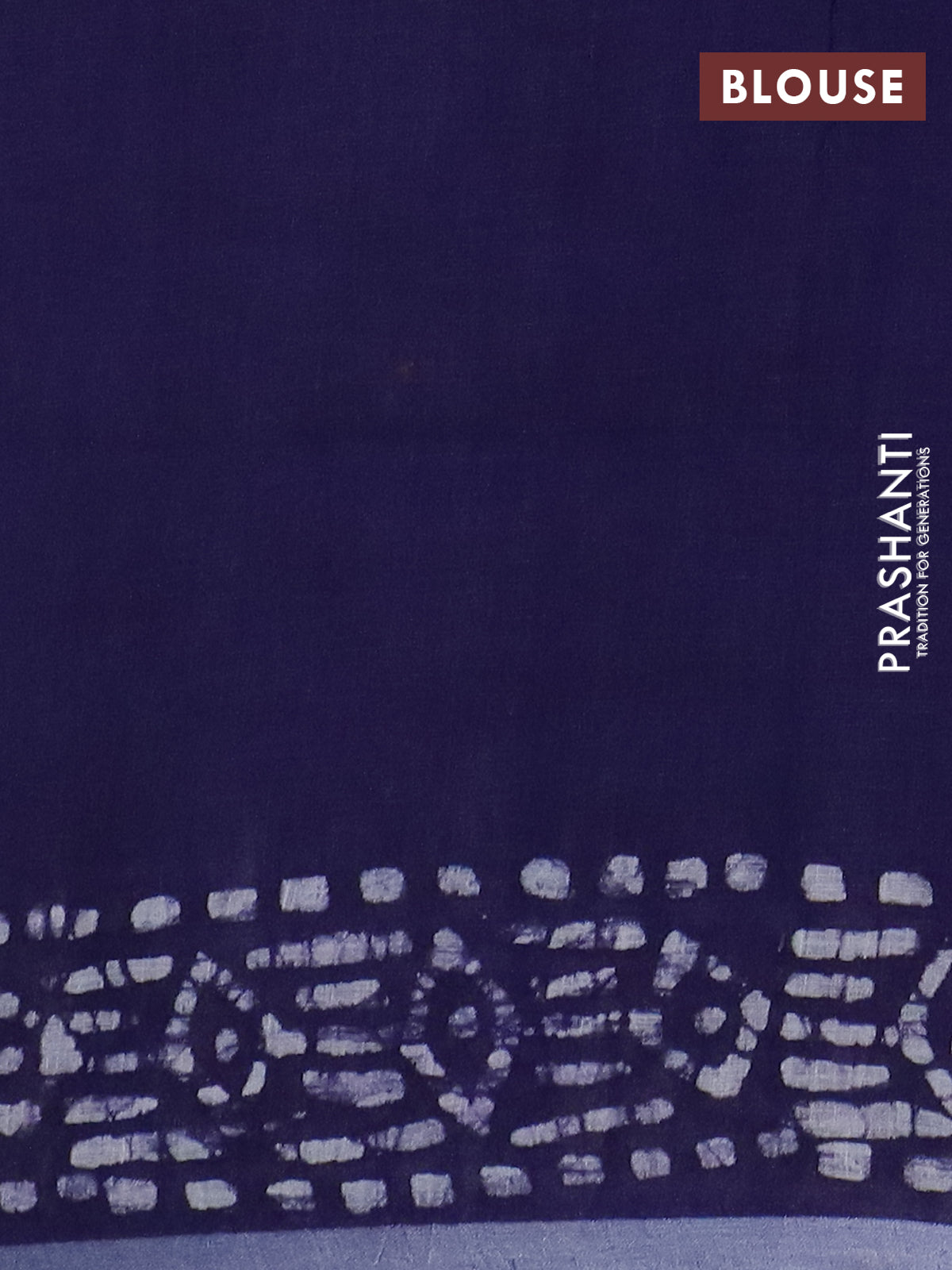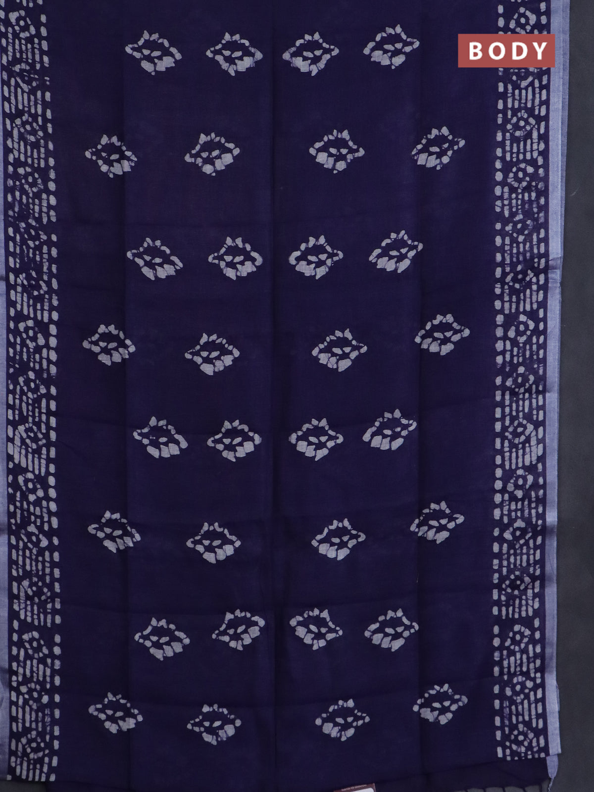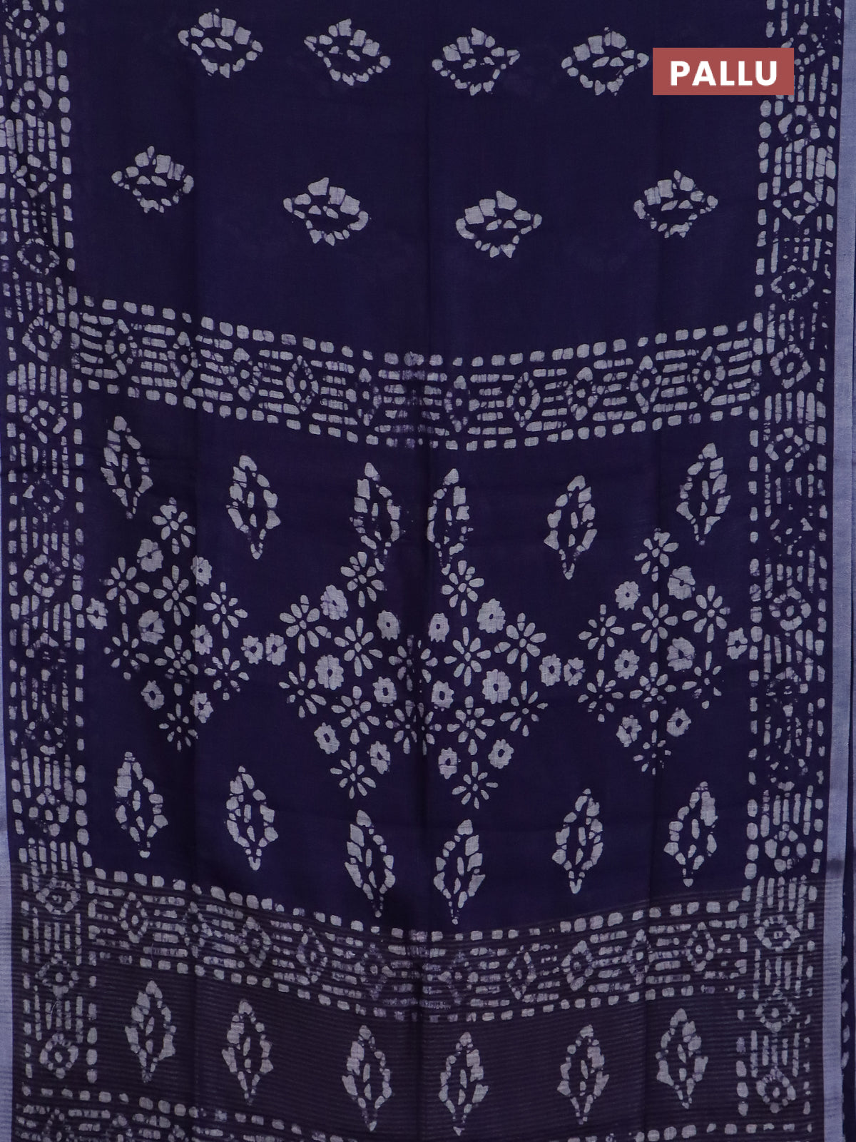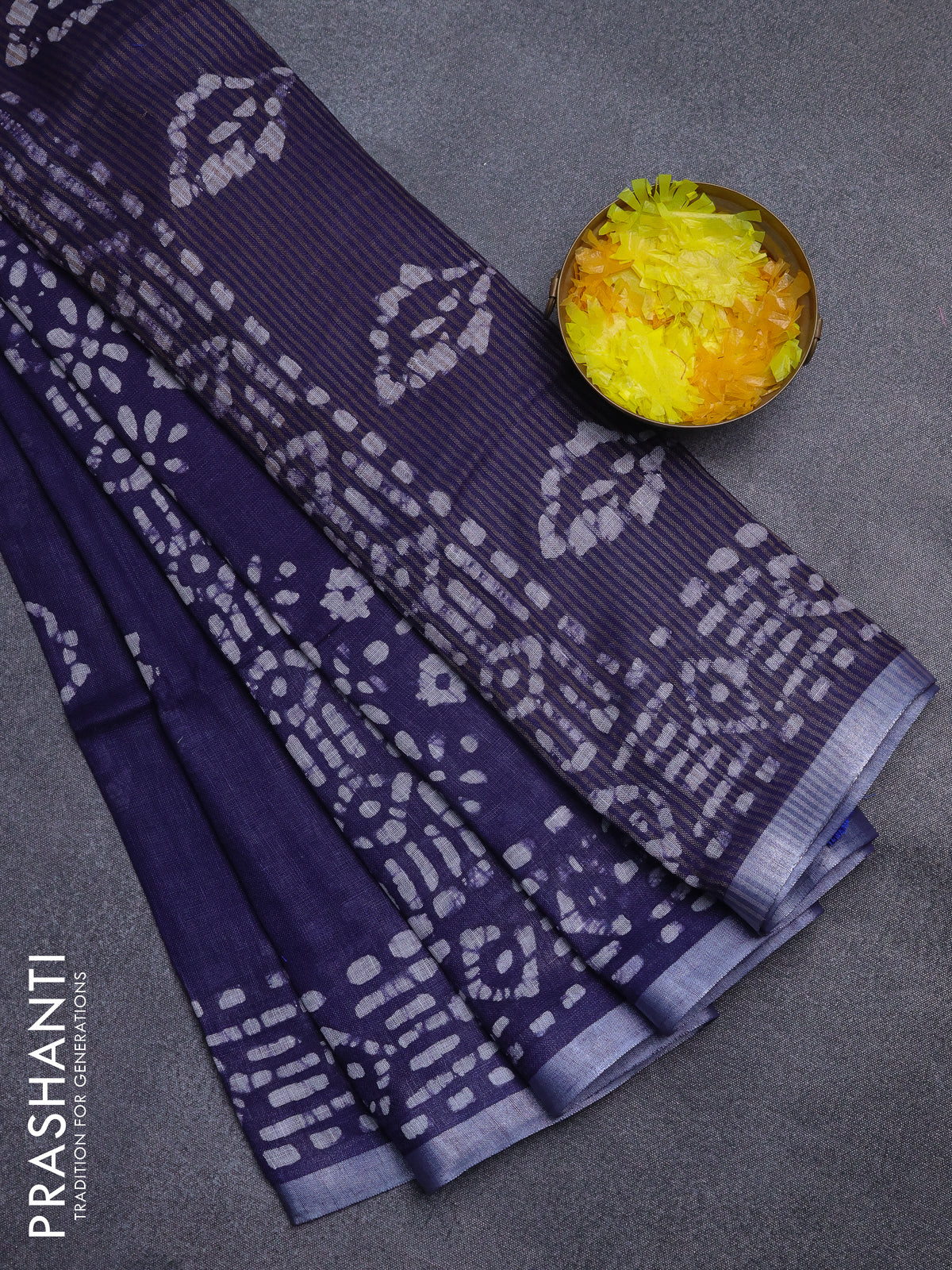 Pure linen saree navy blue with allover batik prints and silver zari woven border