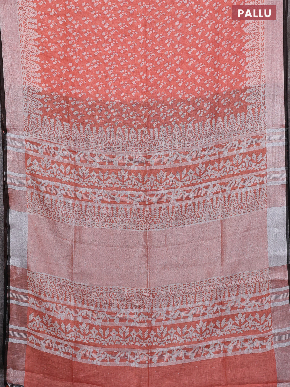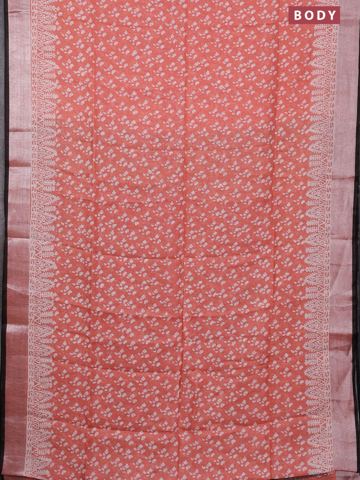 Pure linen saree orange and black with allover prints and silver zari woven border