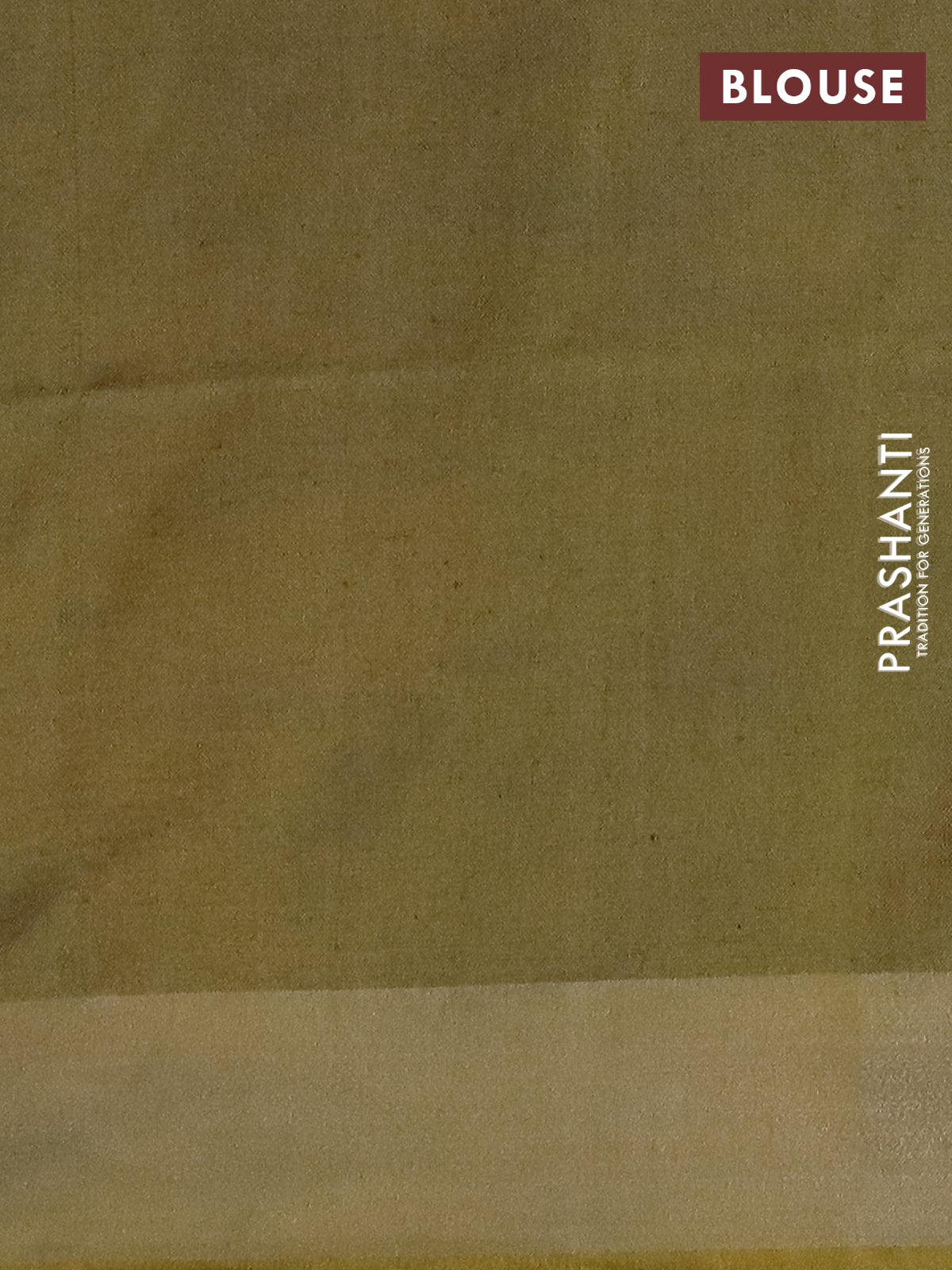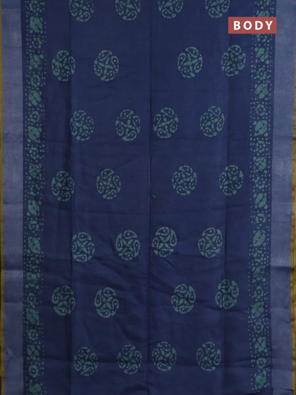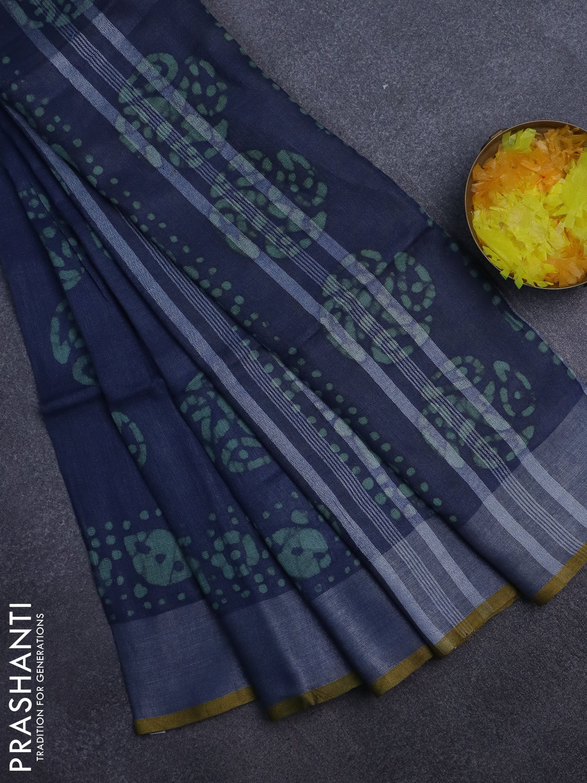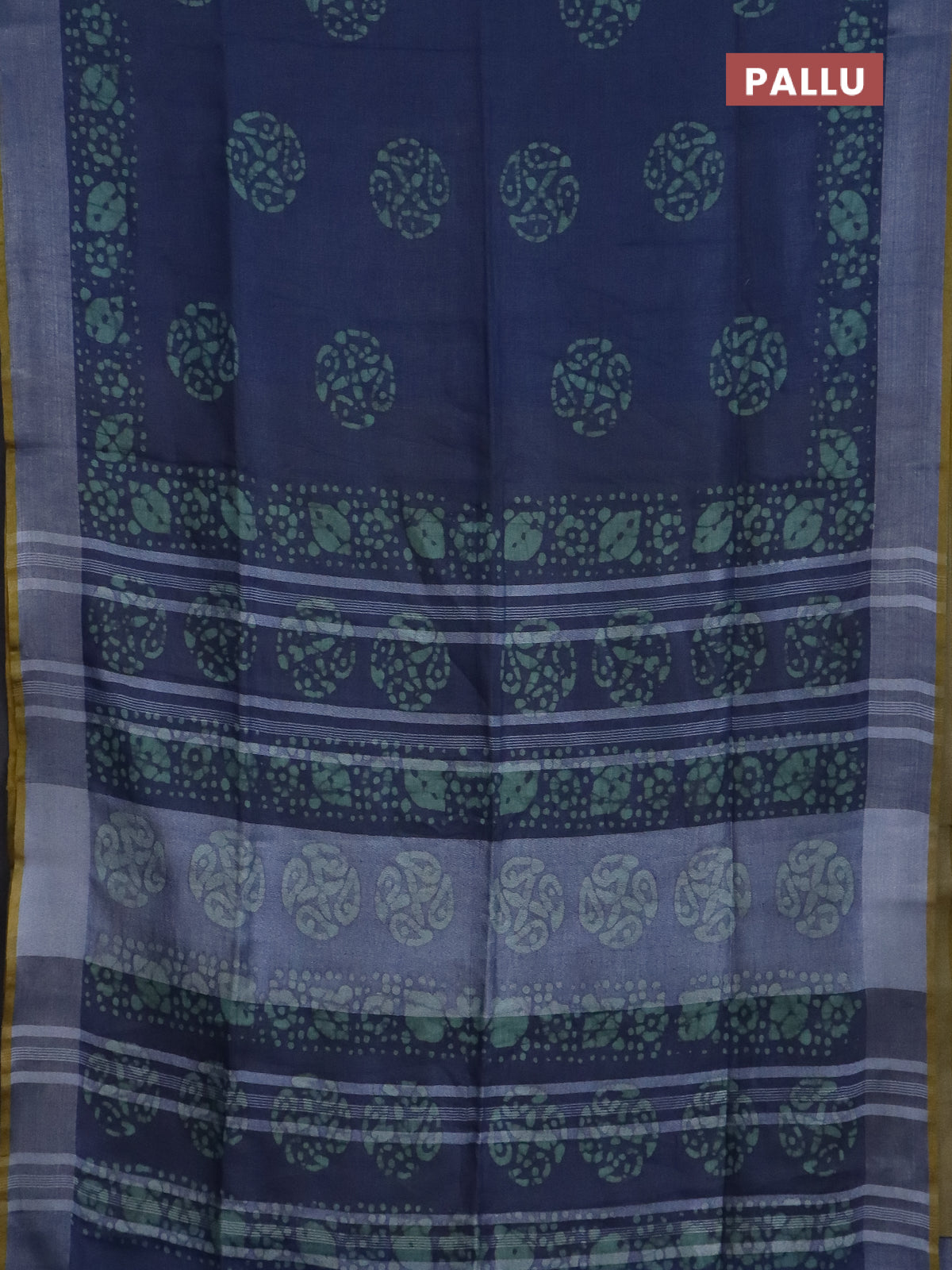 Pure linen saree peacock blue shade and mustard yellow with batik butta prints and silver zari woven border