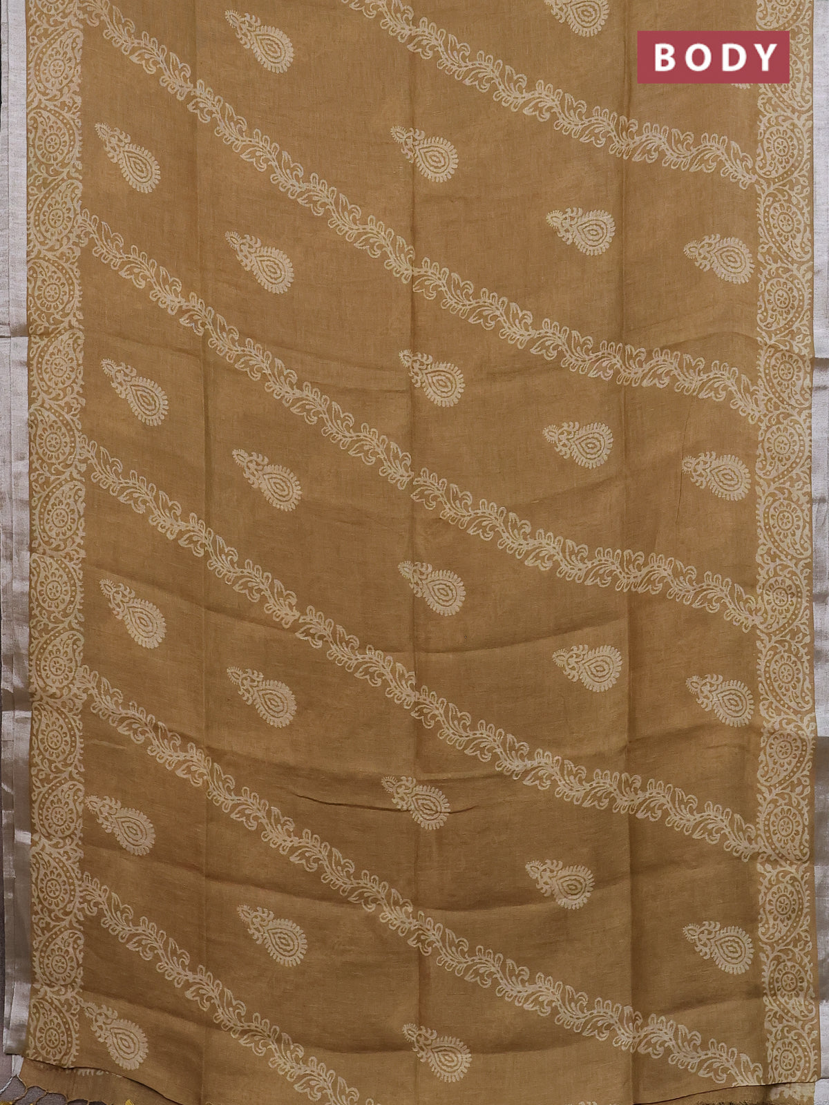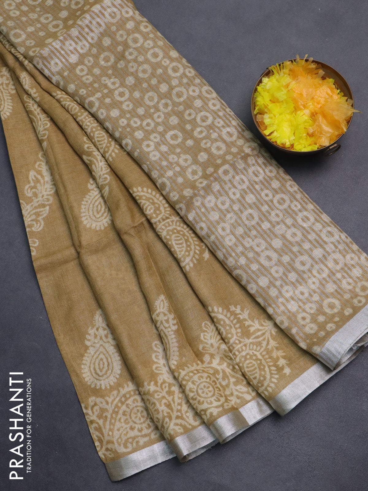 Pure linen saree sandal with allover butta prints and silver zari woven border