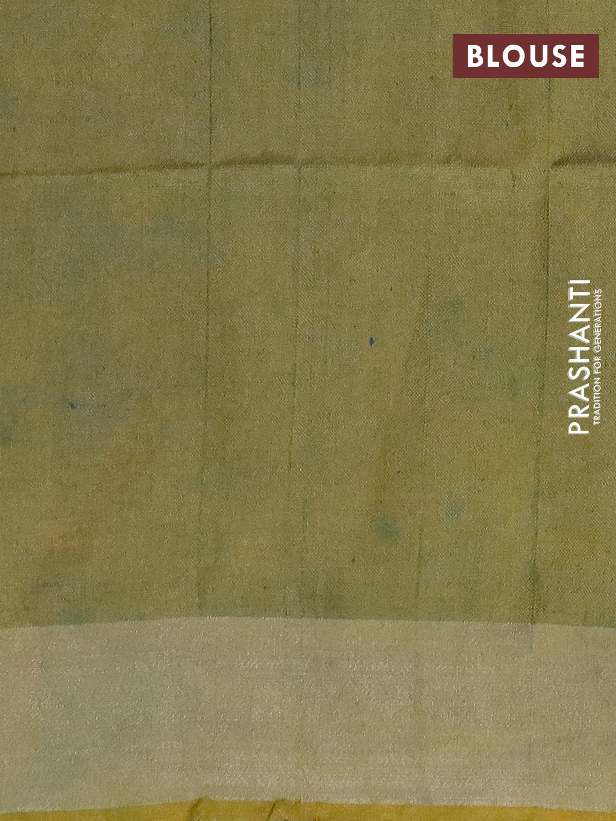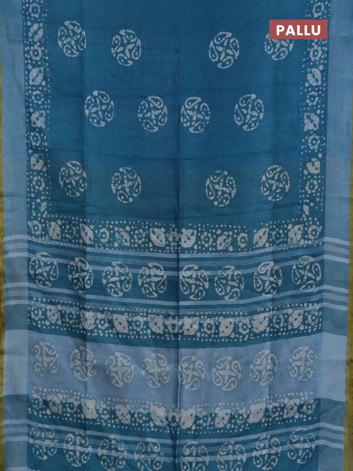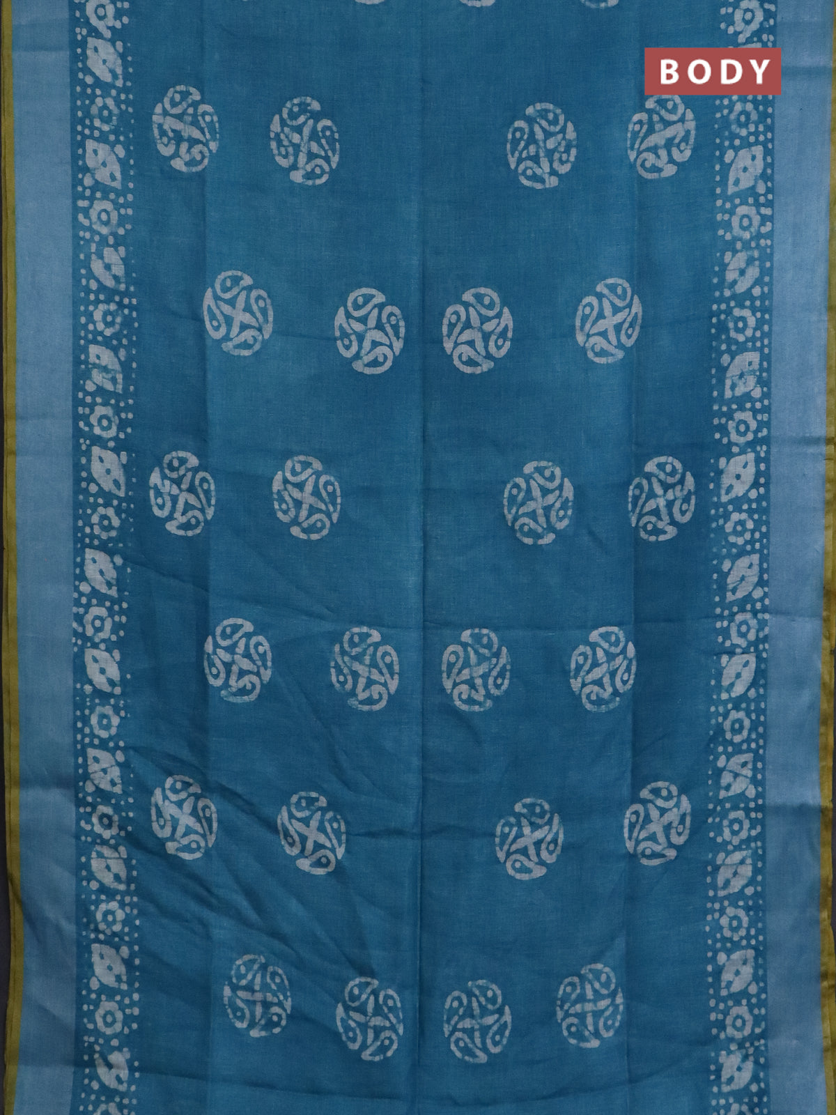 Pure linen saree teal blue with batik butta prints and silver zari woven border