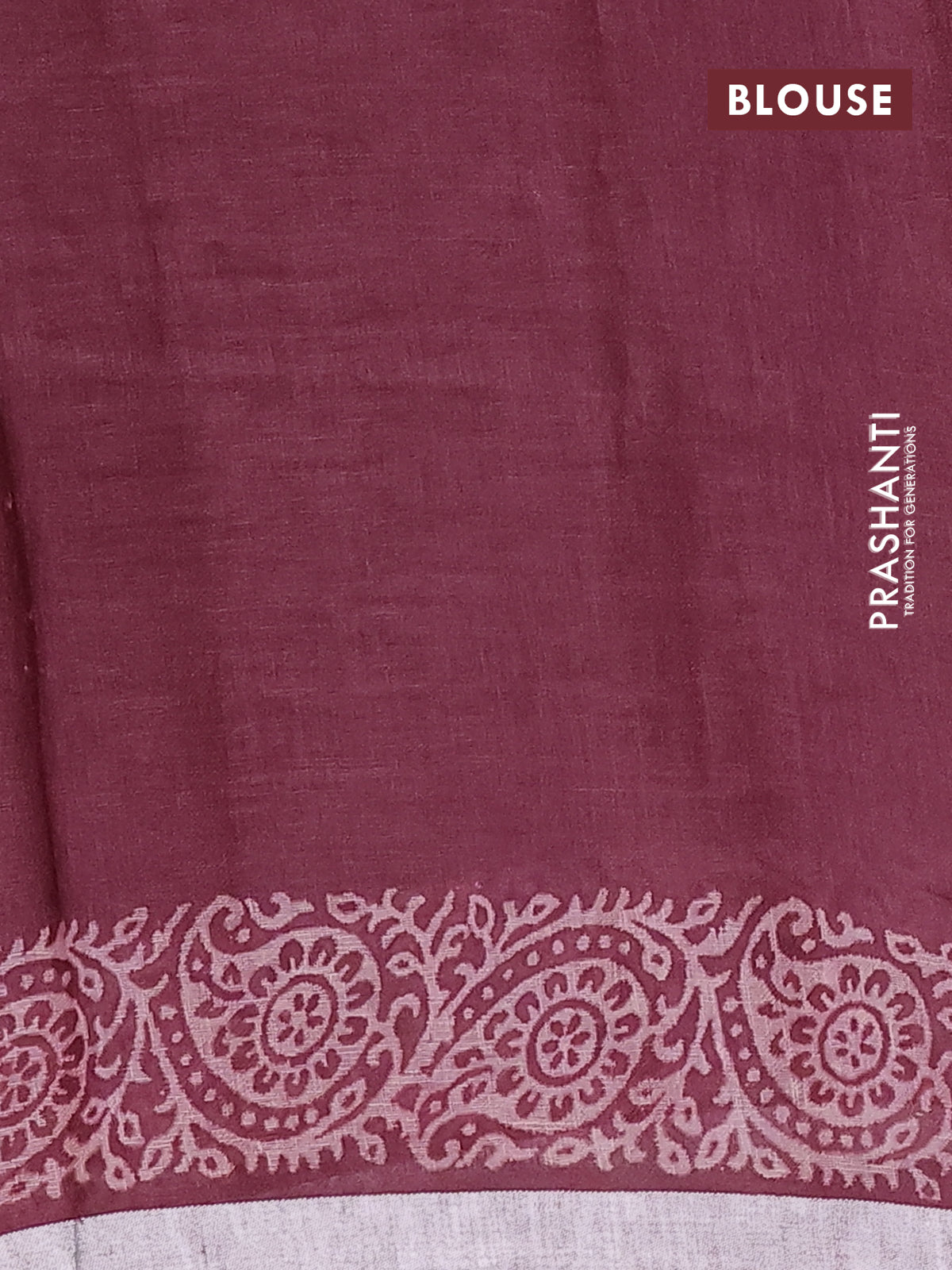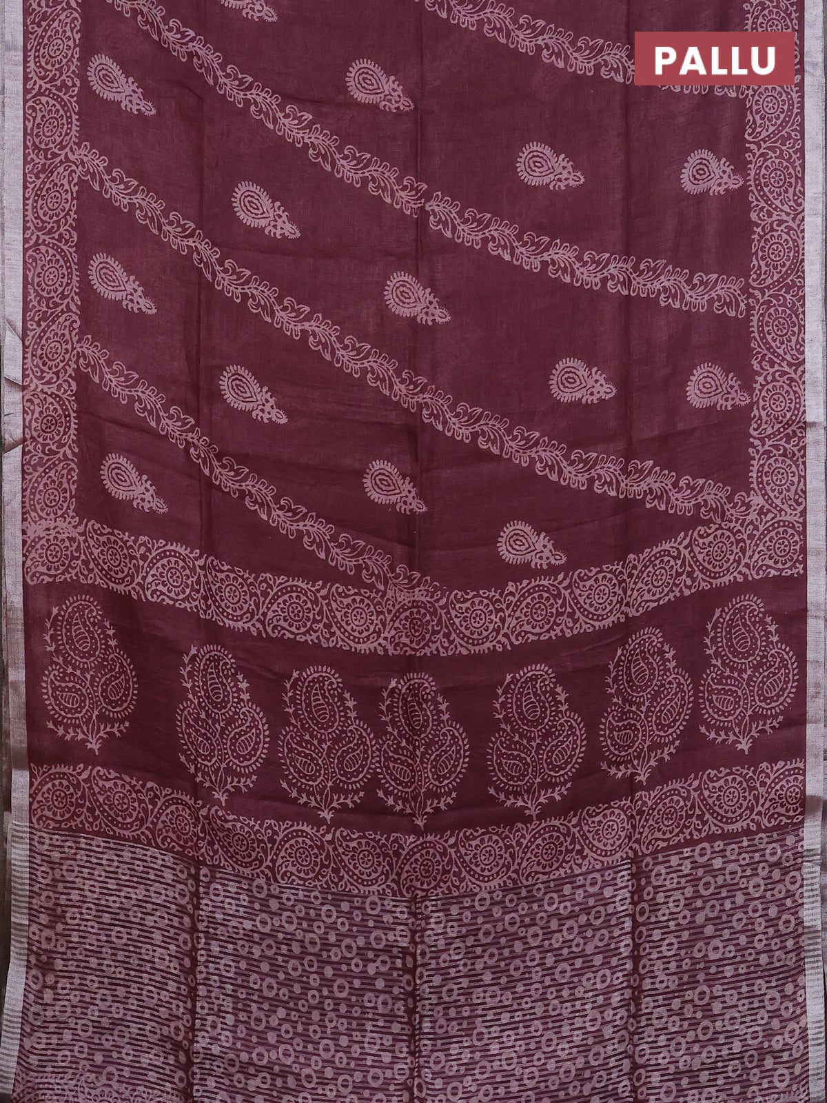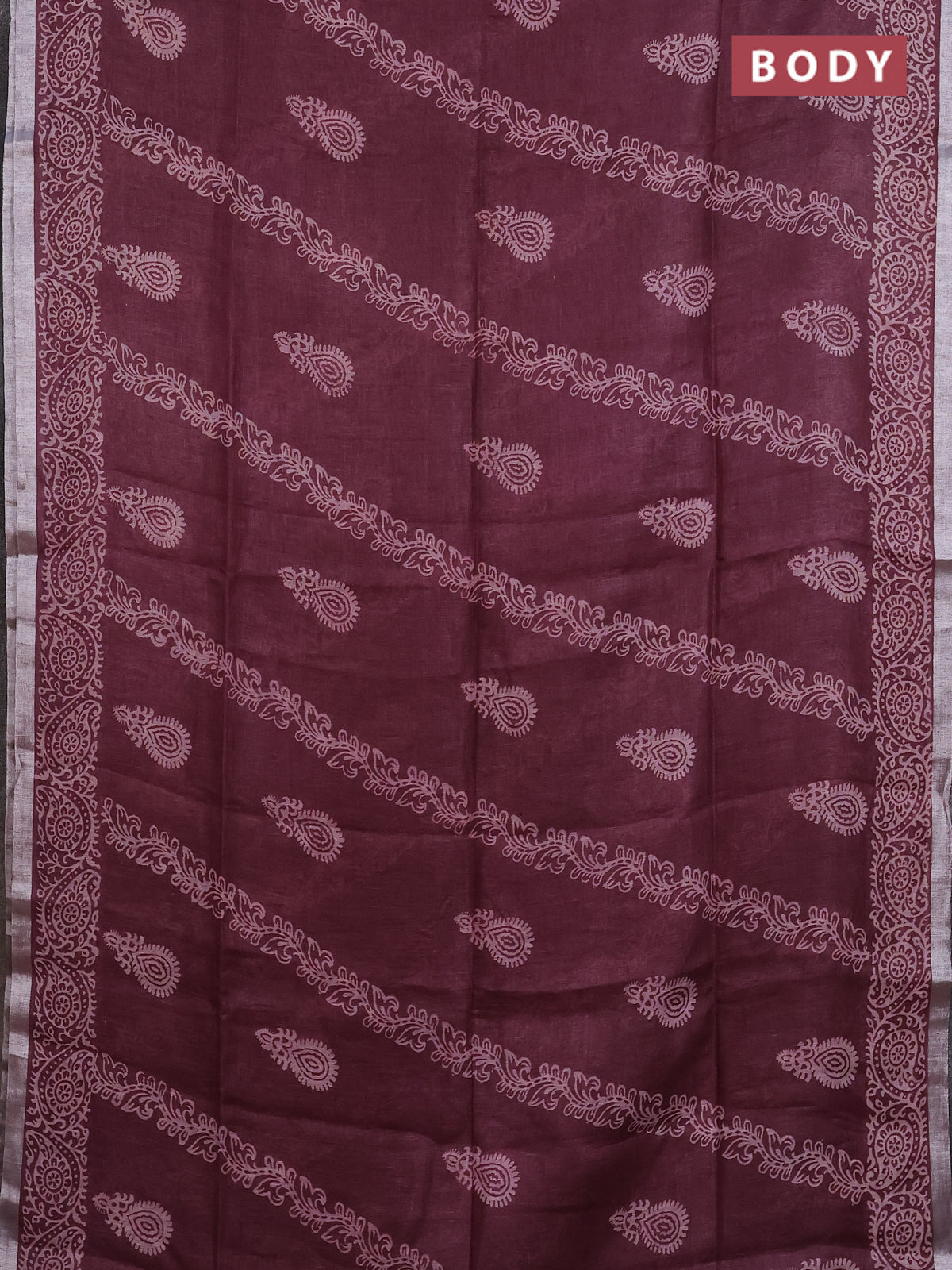 Pure linen saree wine shade with allover butta prints and silver zari woven border