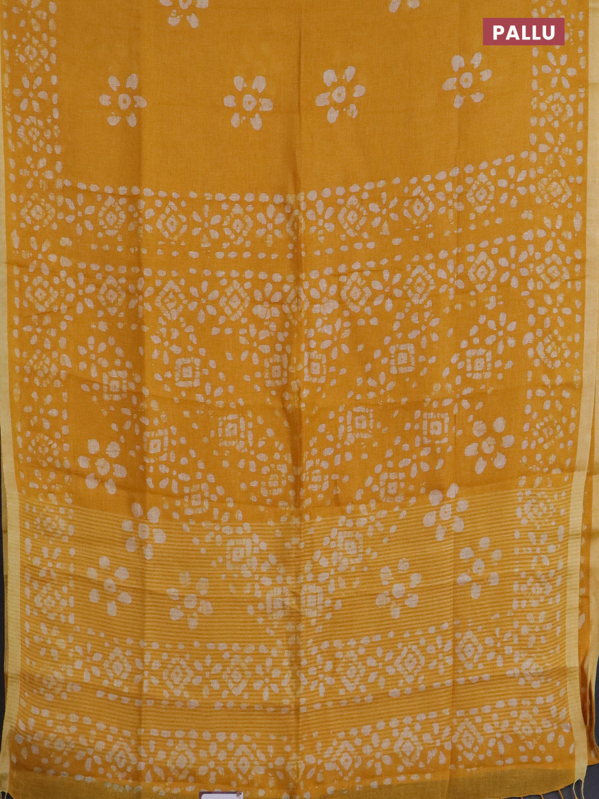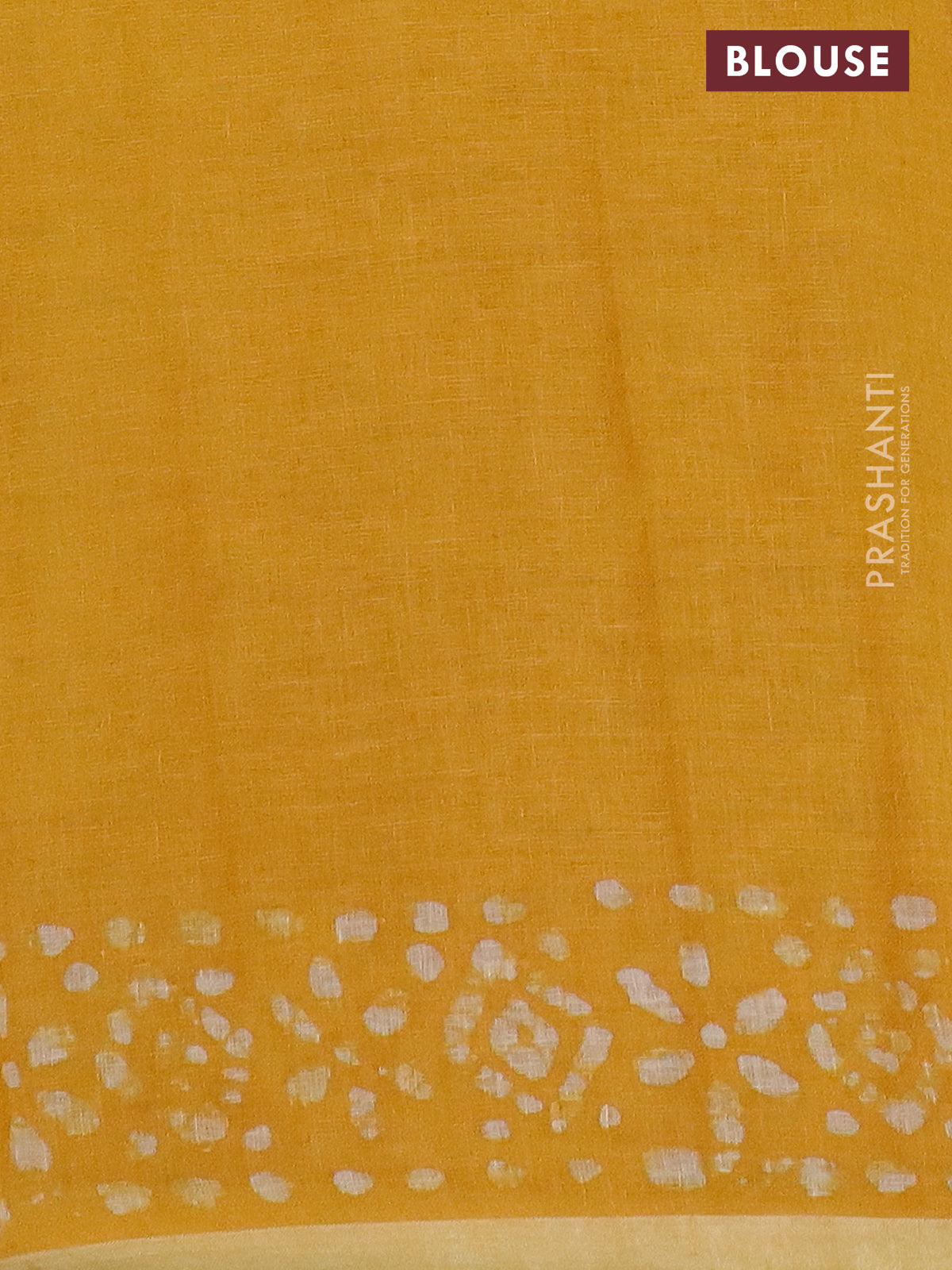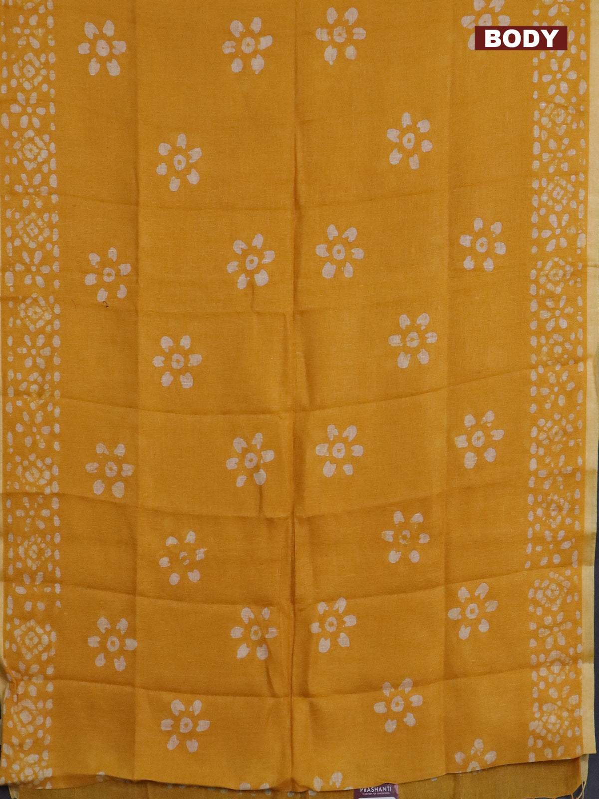 Pure linen saree yellow with batik butta prints and silver zari woven border