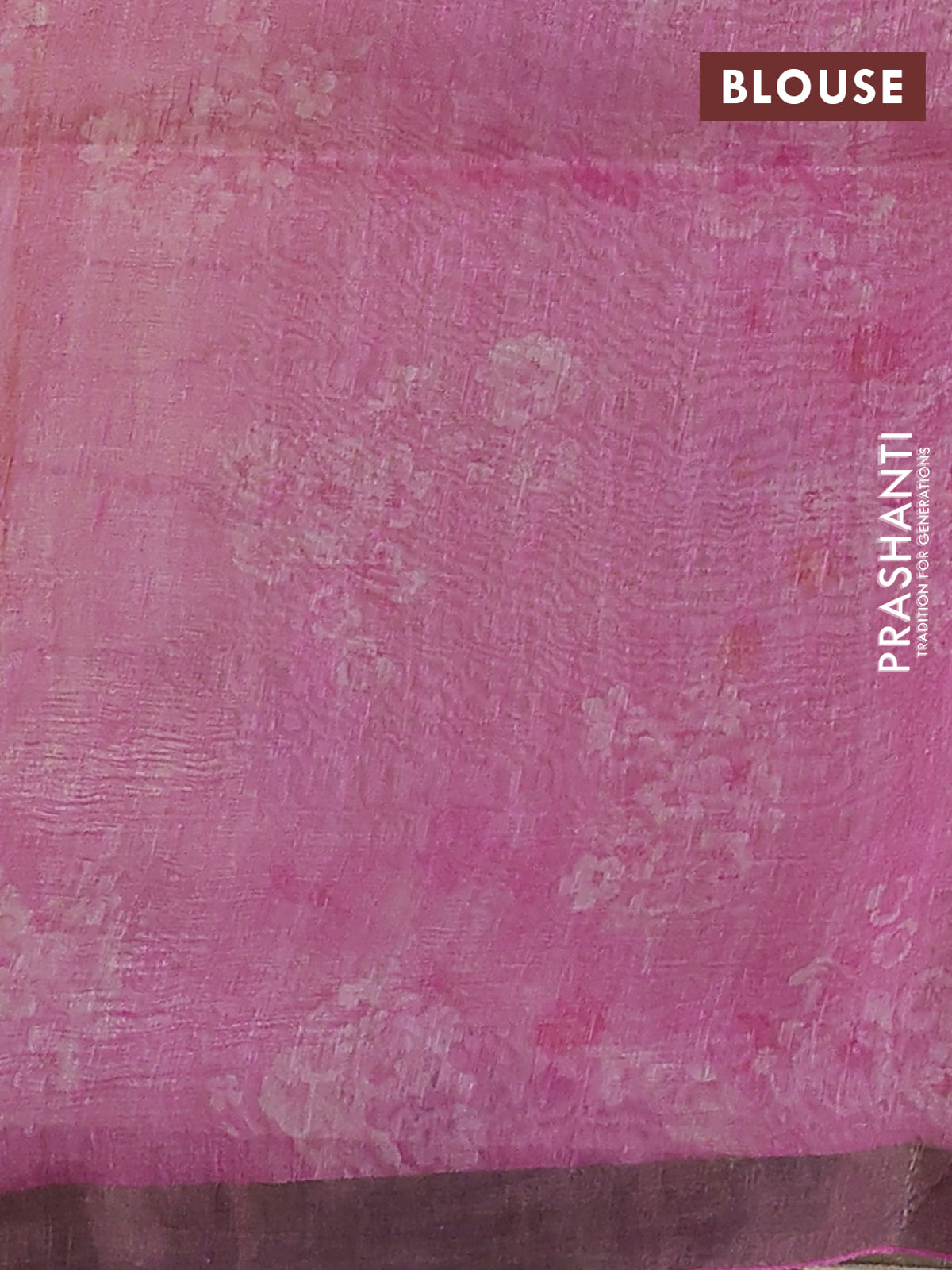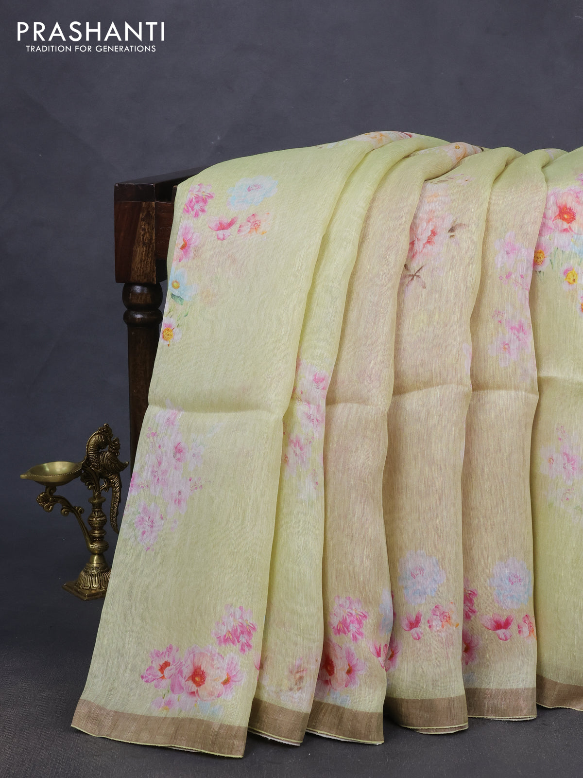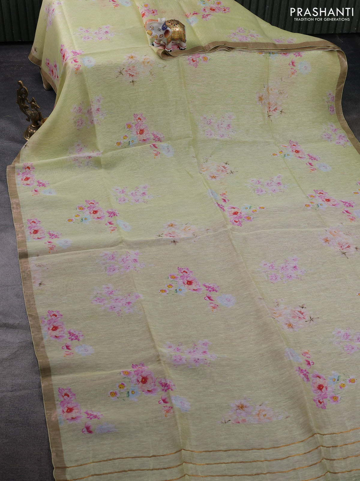 Pure linen silk saree mild pista green and pink shade with floral butta prints and small zari woven border
