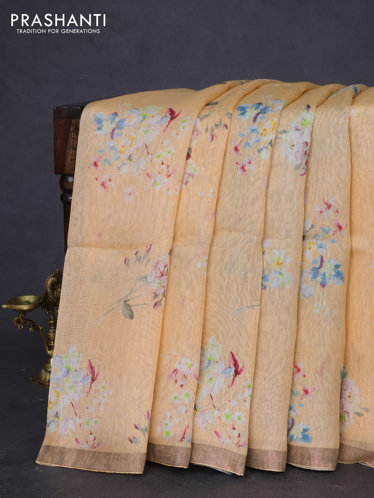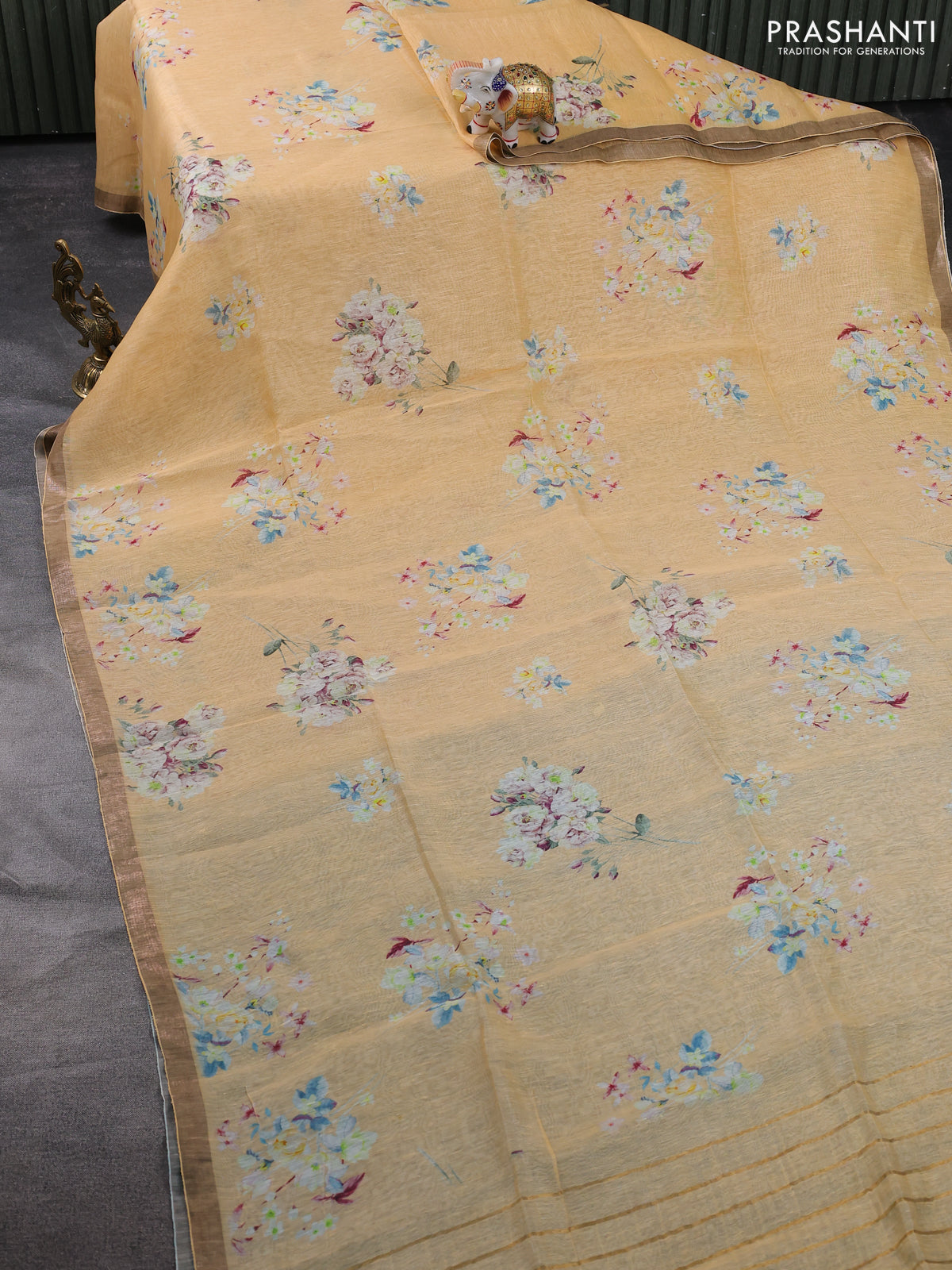 Pure linen silk saree sandal with floral butta prints and small zari woven border