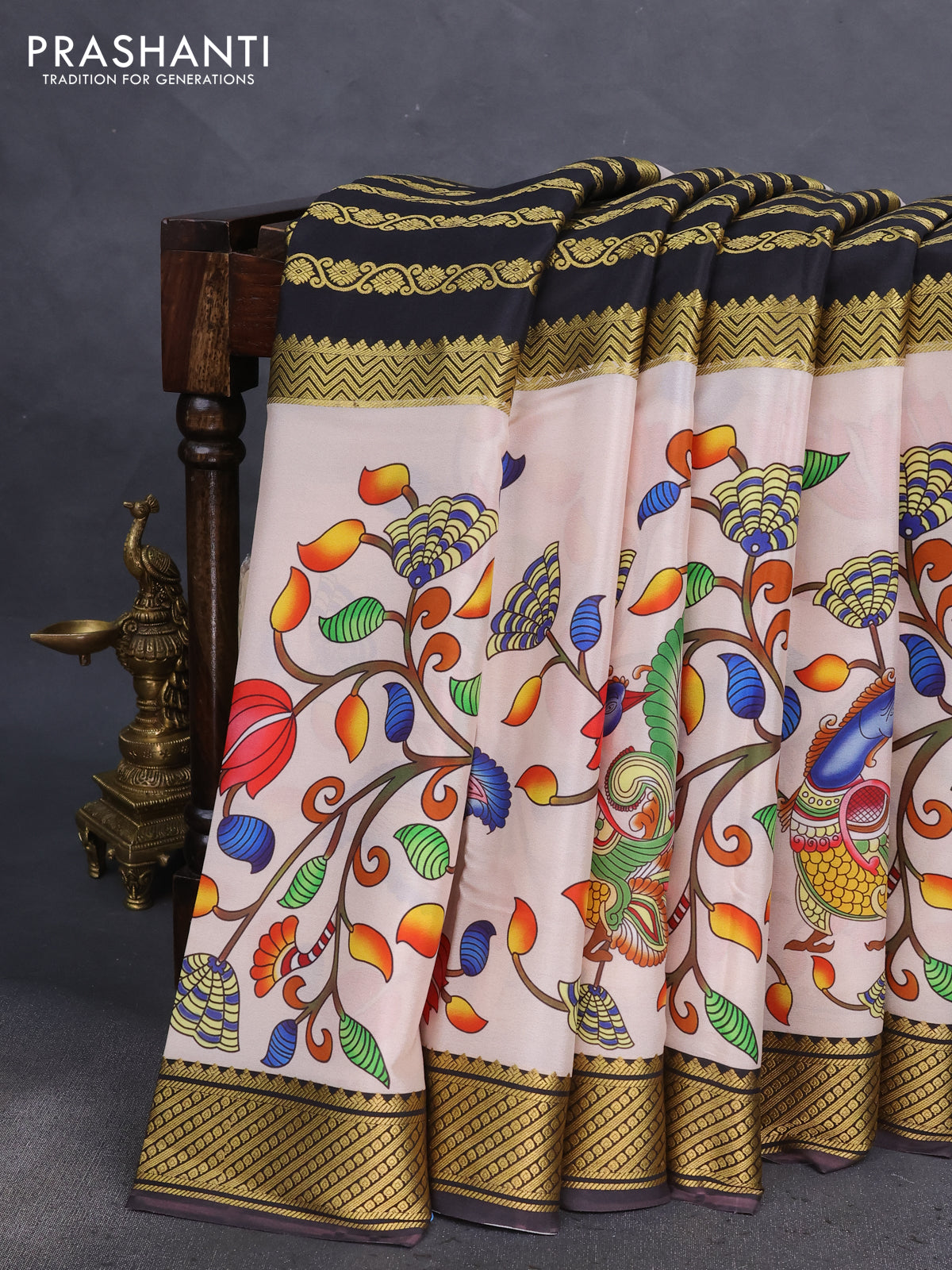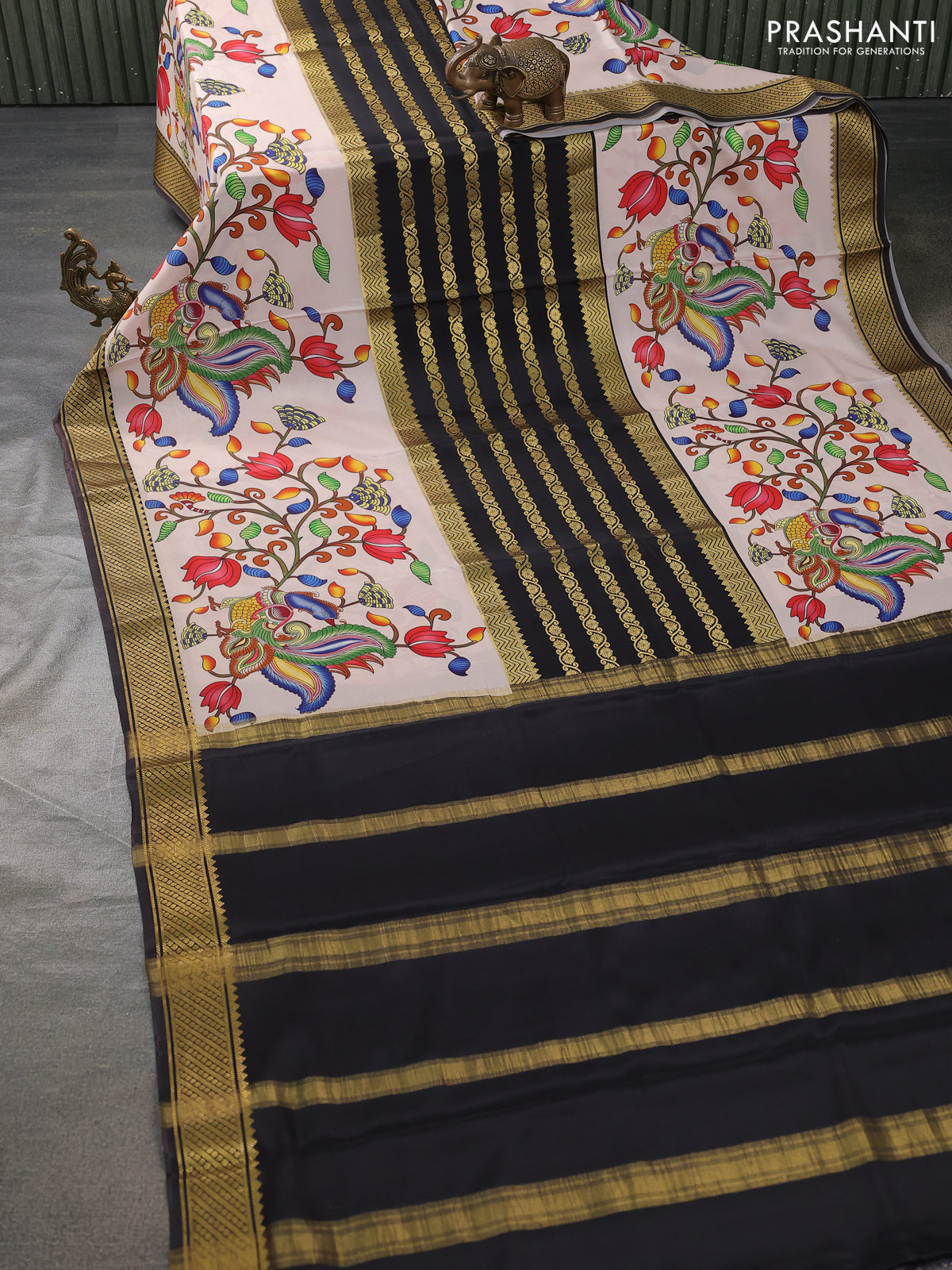 Pure mysore silk saree black and beige with zari stripes pattern and long kalamkari prints border