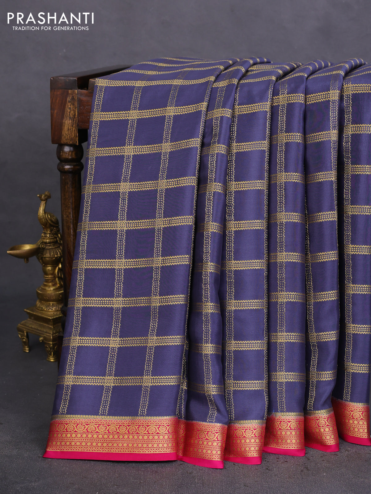 Pure mysore silk saree blue shade and pink with allover zari checked pattern and zari woven border
