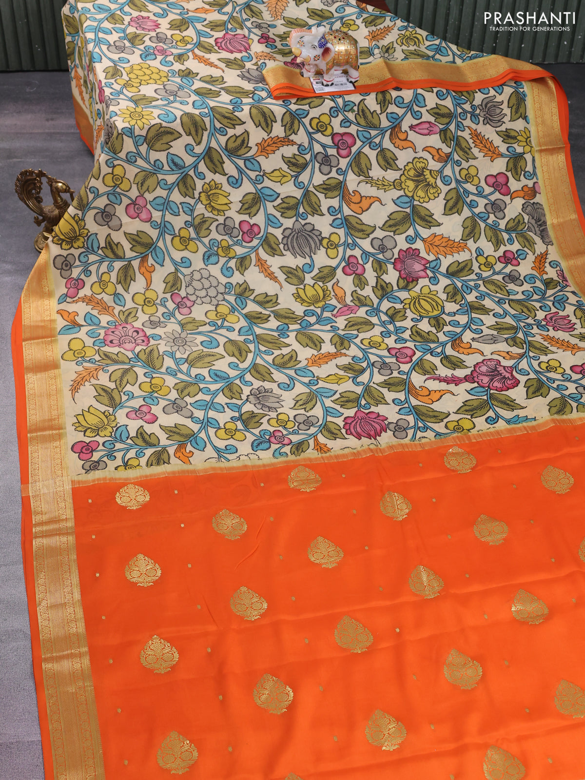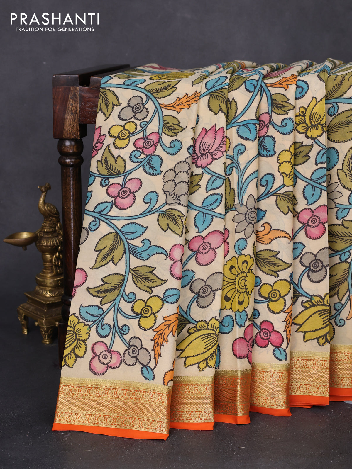 Pure mysore silk saree cream and orange with allover pen kalamkari prints and zari woven border