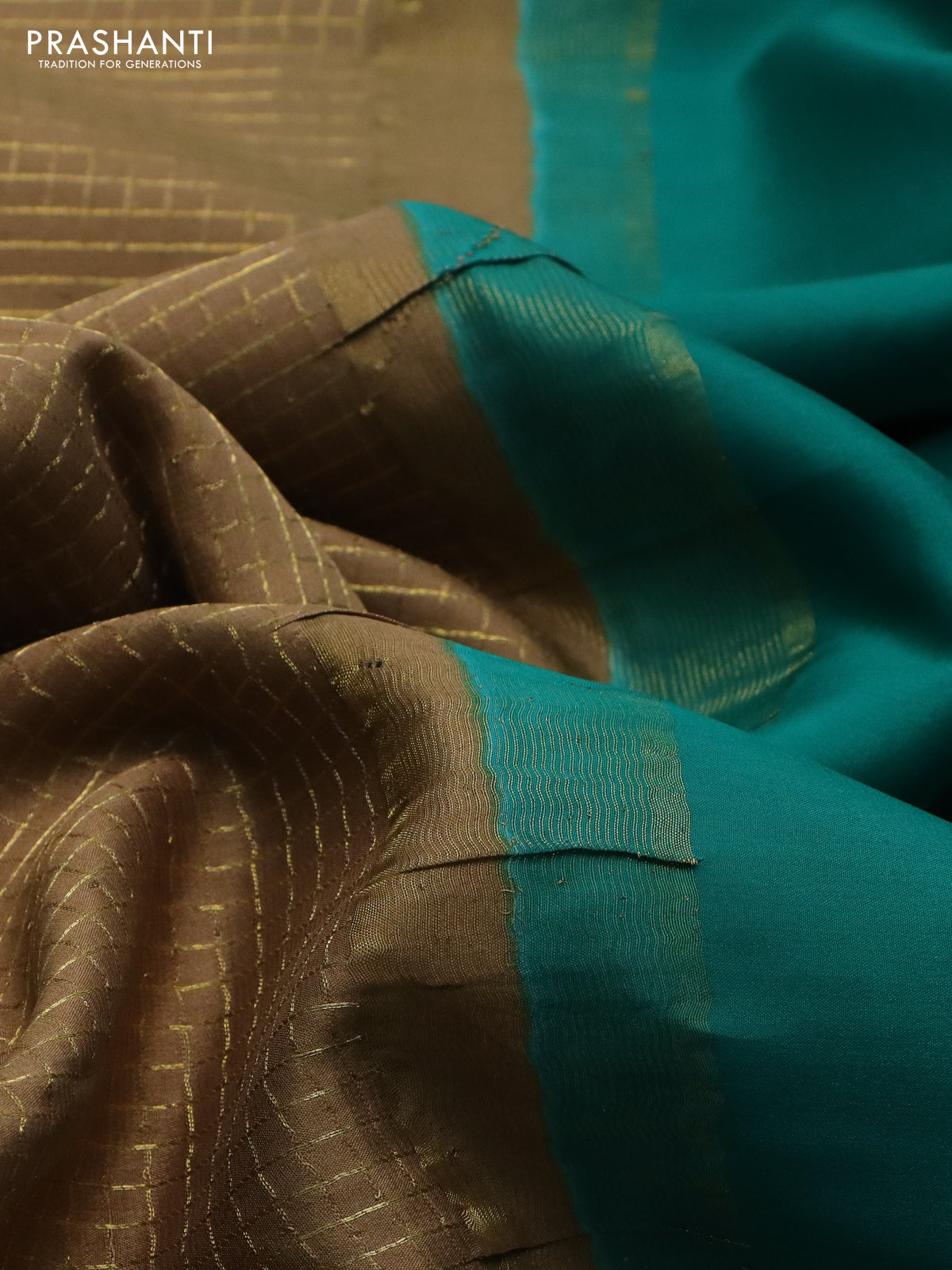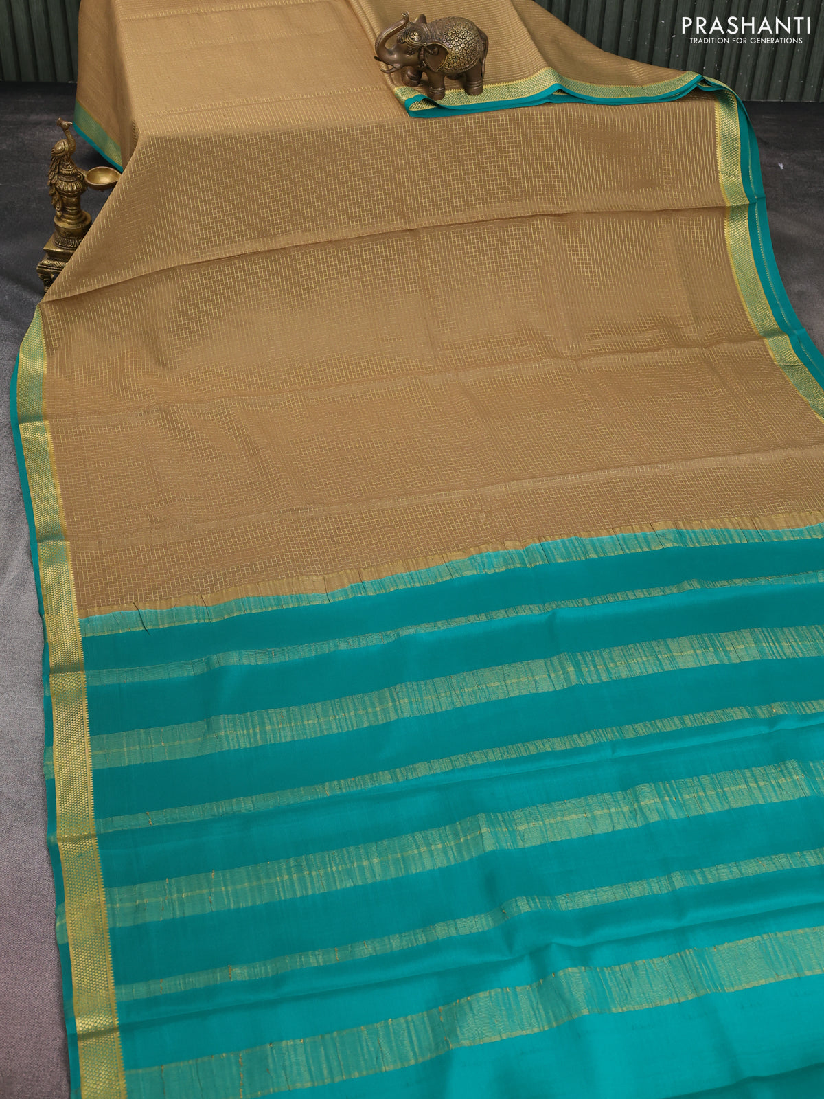 Pure mysore silk saree dark sandal and teal green with allover small zari checked pattern and zari woven border