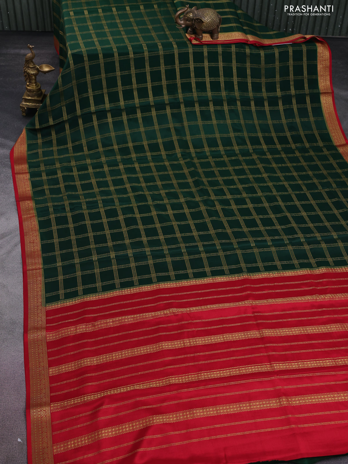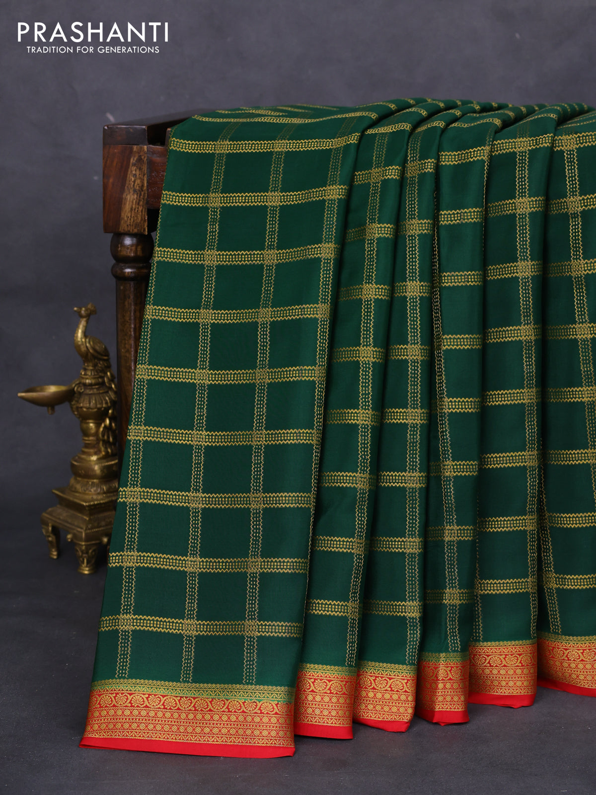 Pure mysore silk saree green and red with allover zari checked pattern and zari woven border