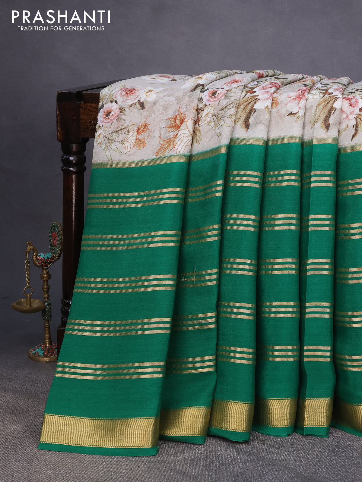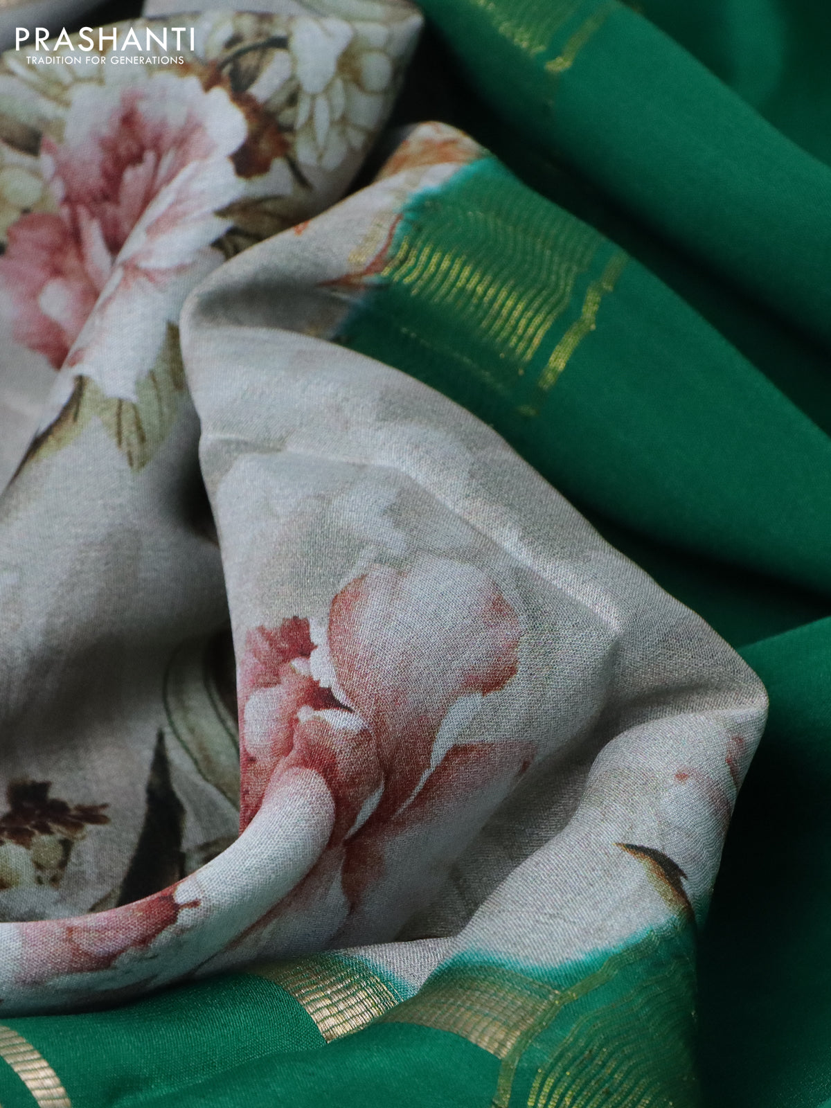 Pure mysore silk saree grey and green with kalamkari digital prints and long zari woven border
