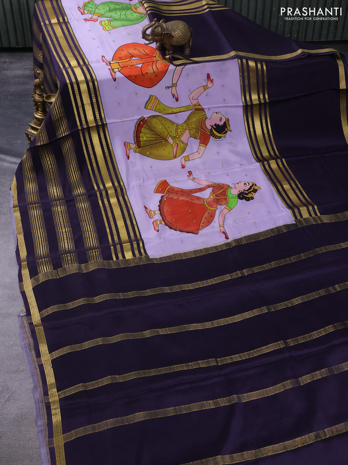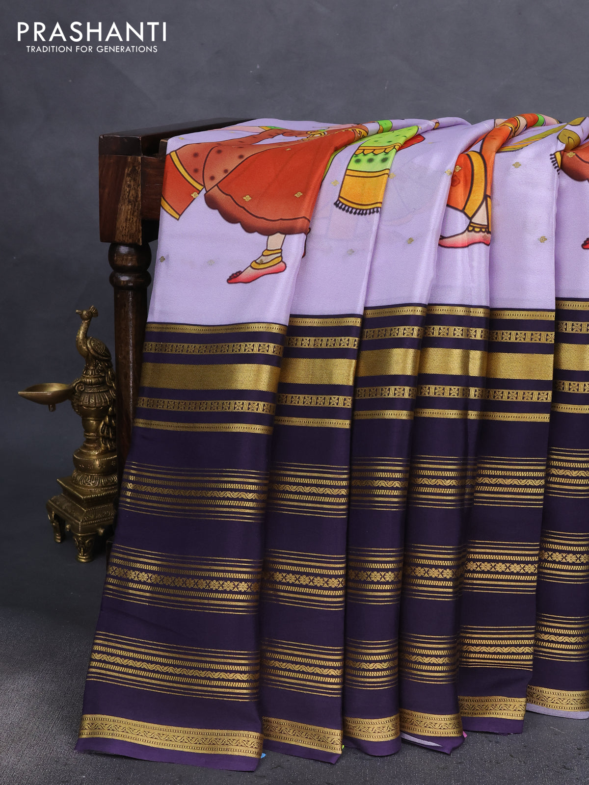 Pure mysore silk saree lavender and dark blue with digital prints & zari buttas and long zari woven border