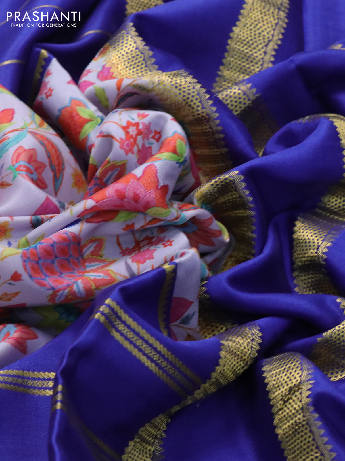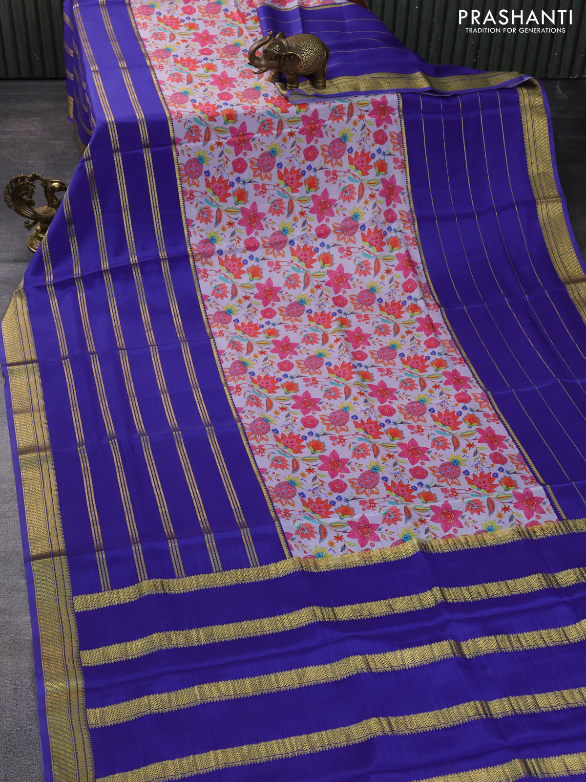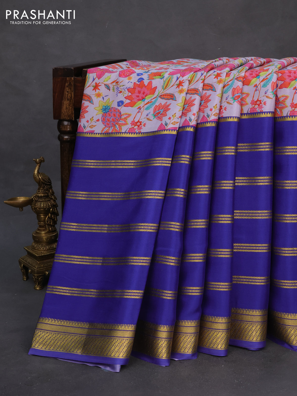 Pure mysore silk saree lavender shade and blue with kalamkari digital prints and long zari woven border