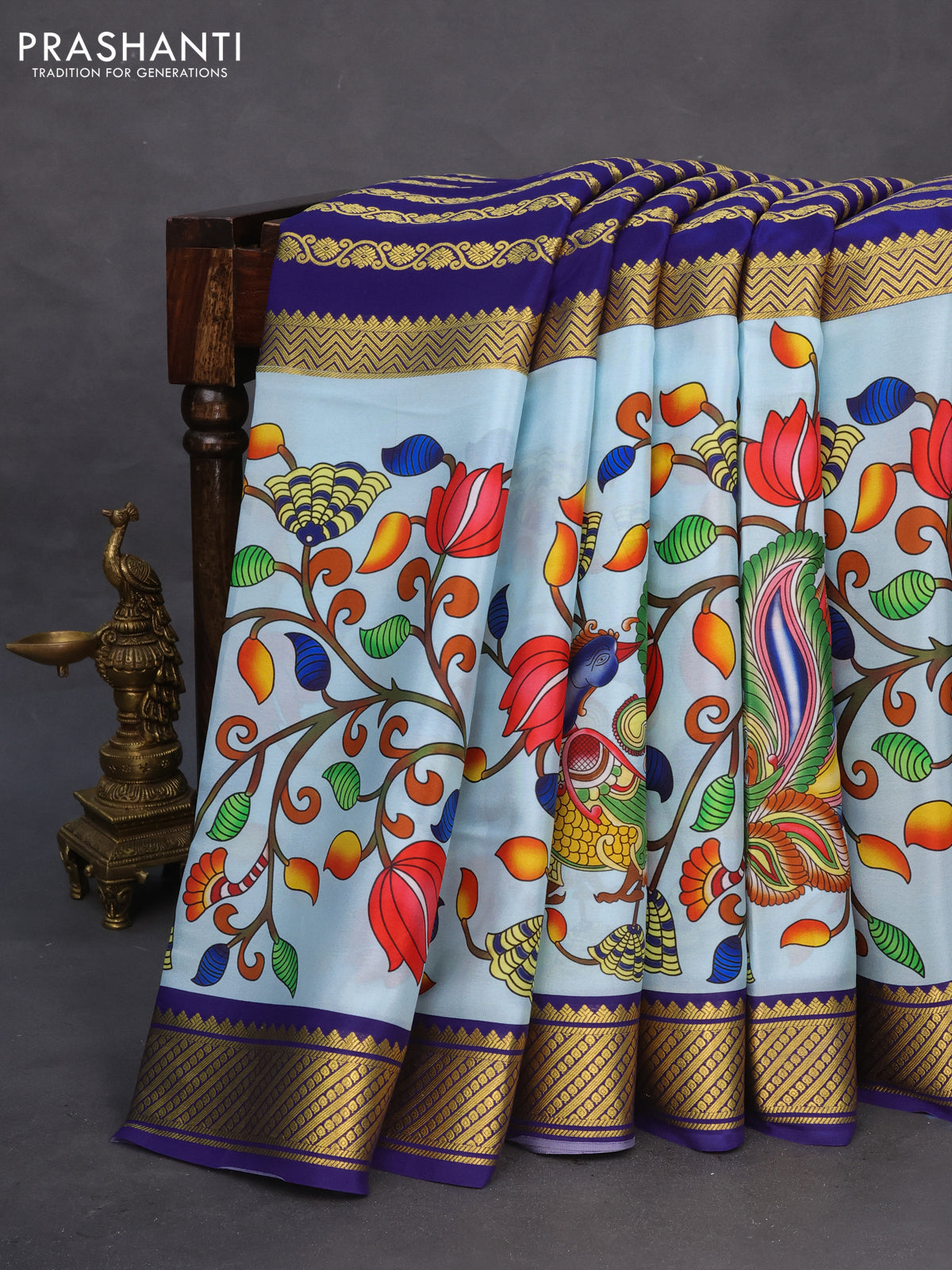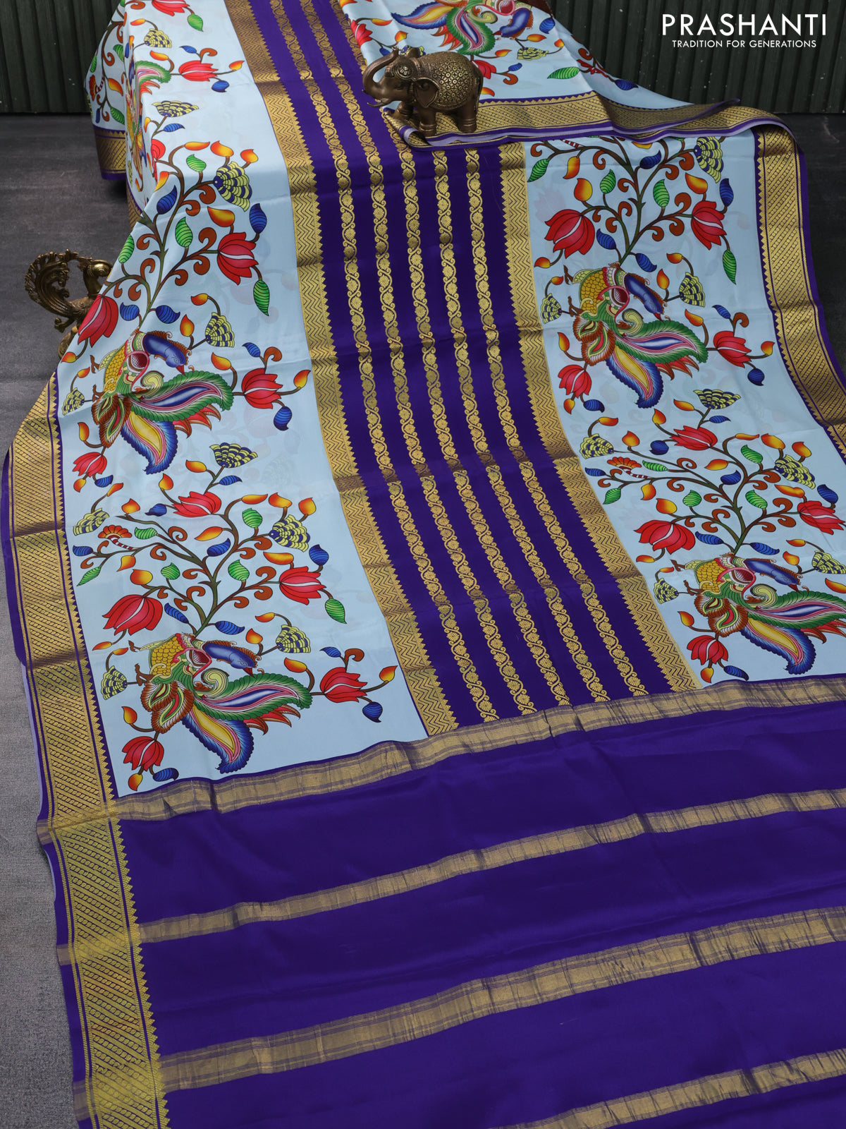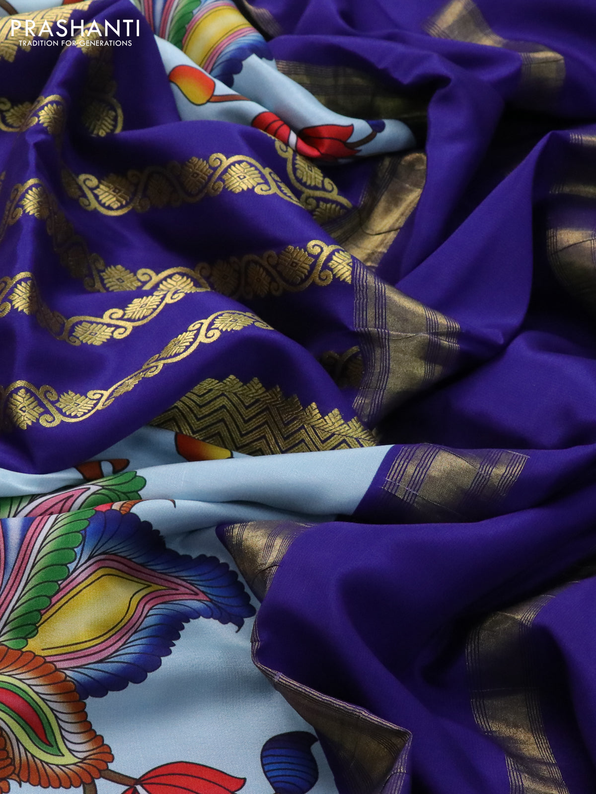 Pure mysore silk saree light blue and blue with zari stripe weaves and long kalamkari digital printed border