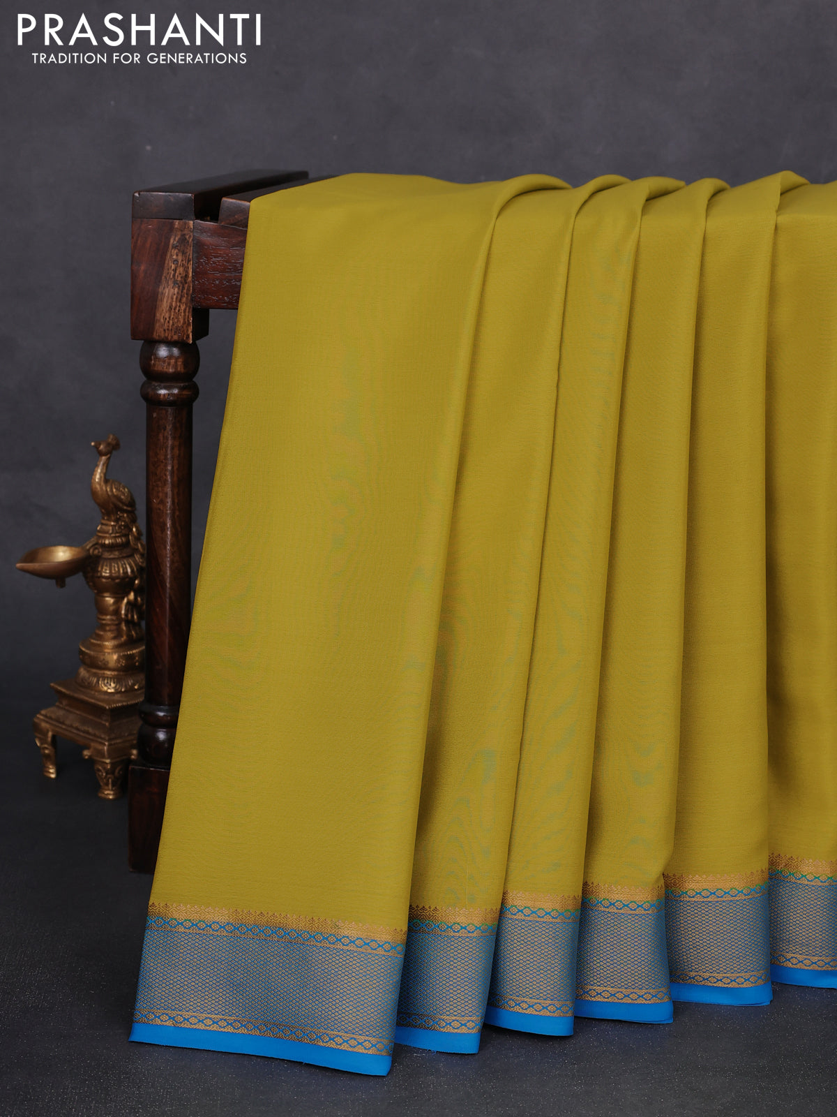 Pure mysore silk saree lime green and cs blue with plain body and zari woven border