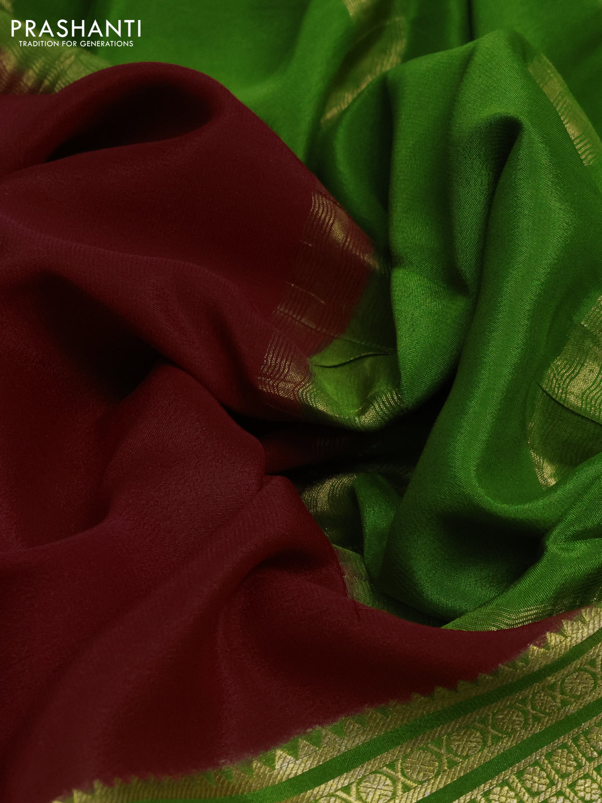 Pure mysore silk saree maroon and green with plain body and long zari woven border