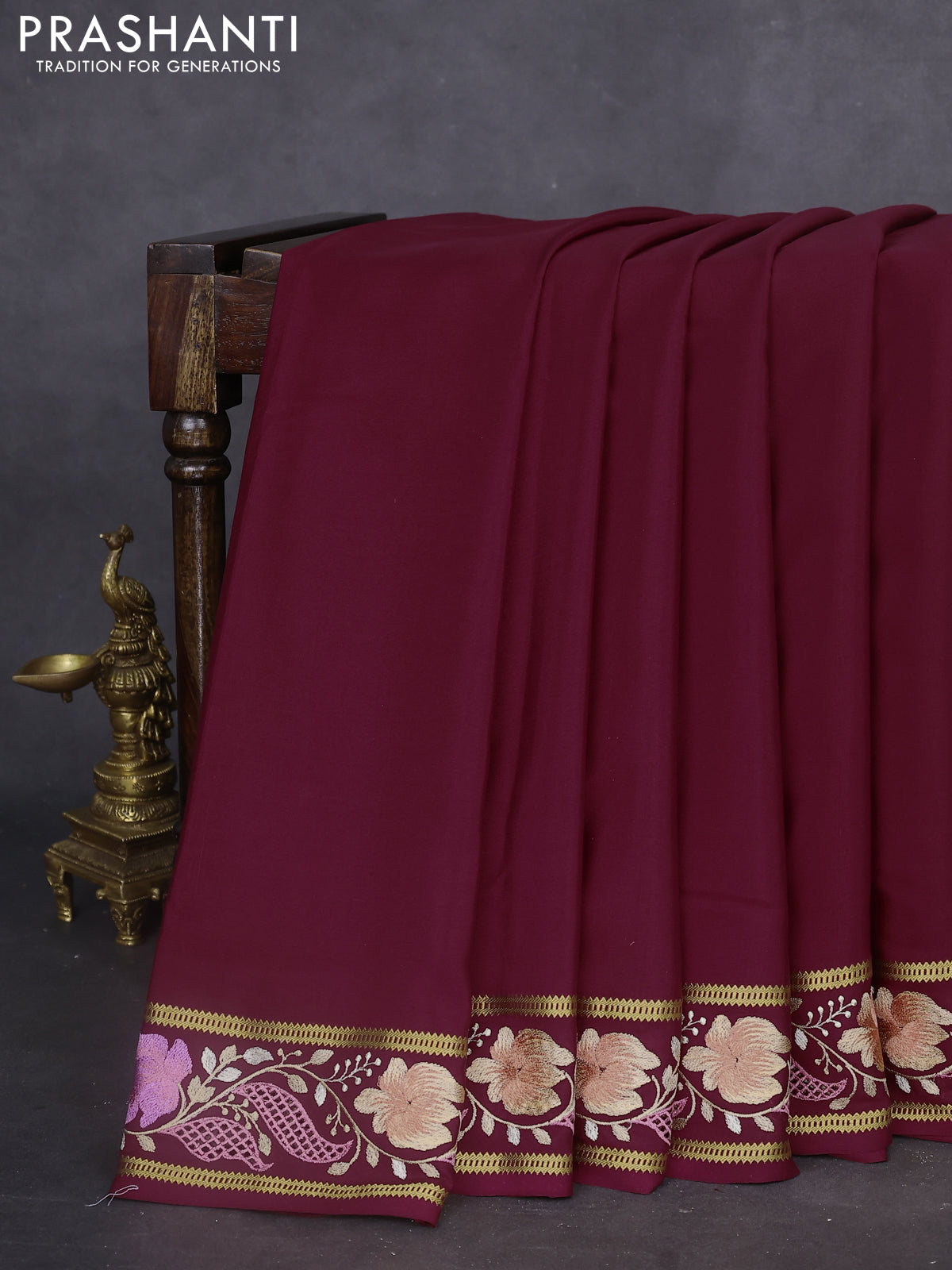Pure mysore silk saree maroon with plain body and floral embroidery cut work border