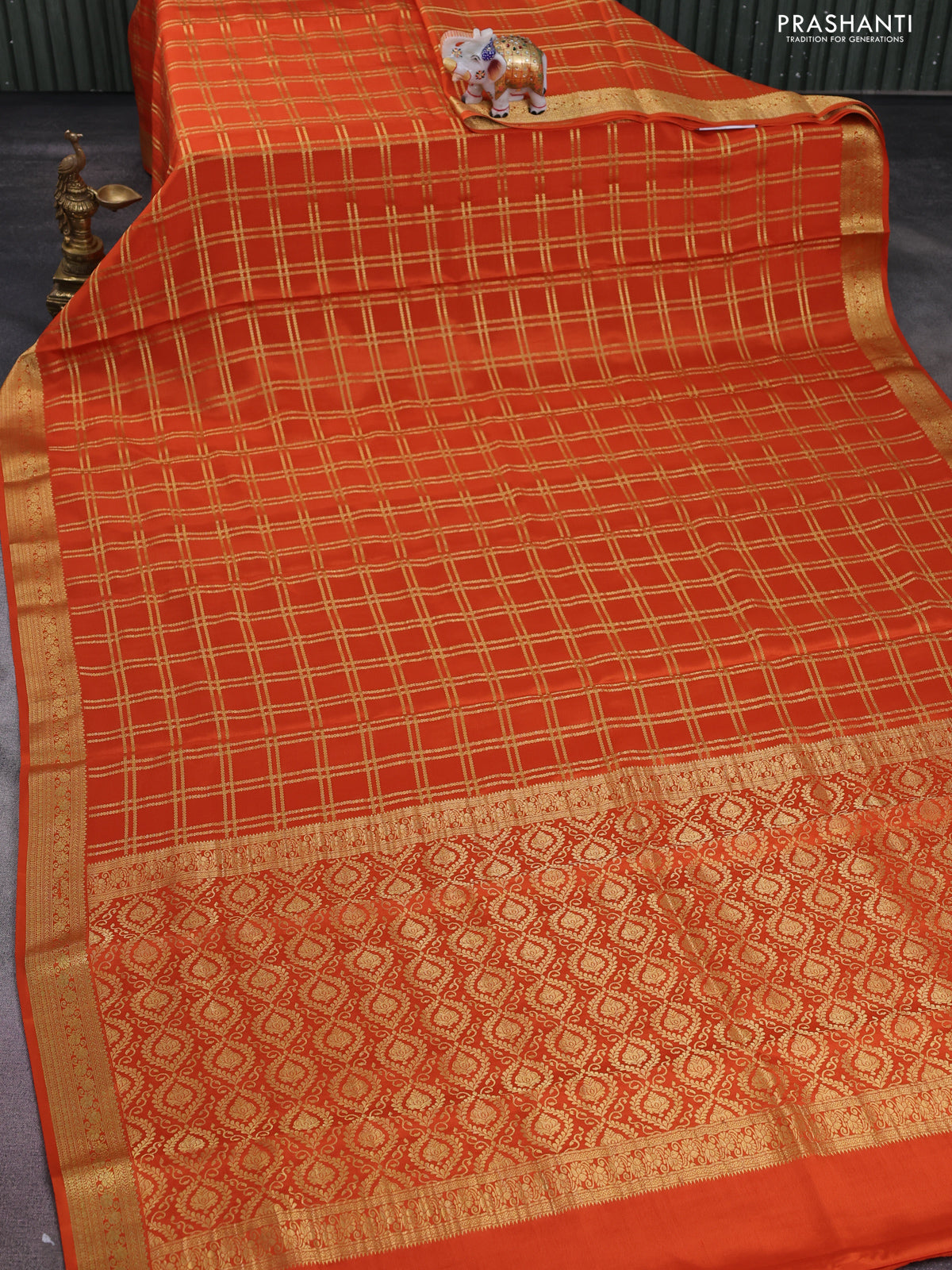 Pure mysore silk saree orange with allover zari checked pattern and zari woven border