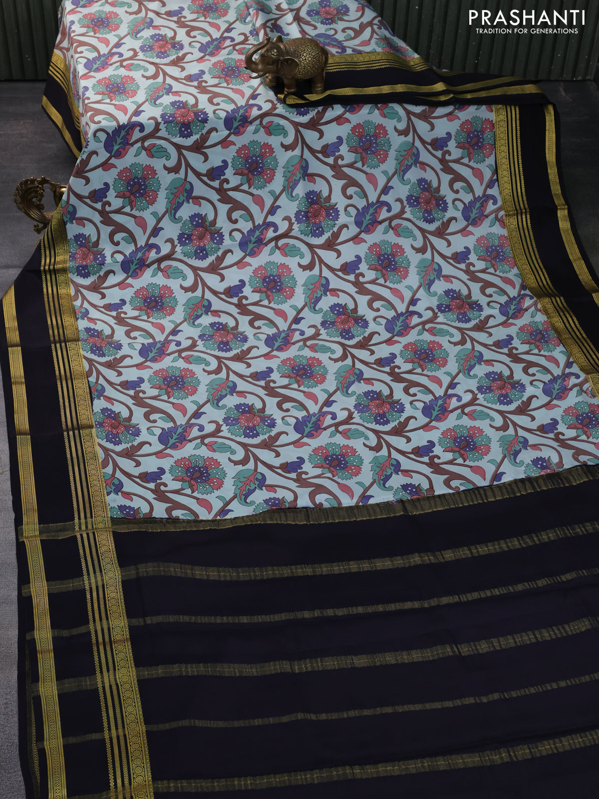 Pure mysore silk saree pastel blue and black with allover floral digital prints and rettapet zari woven border