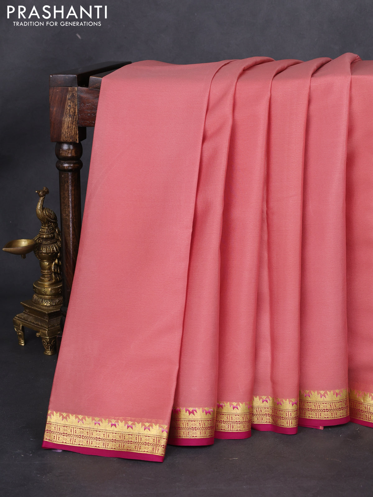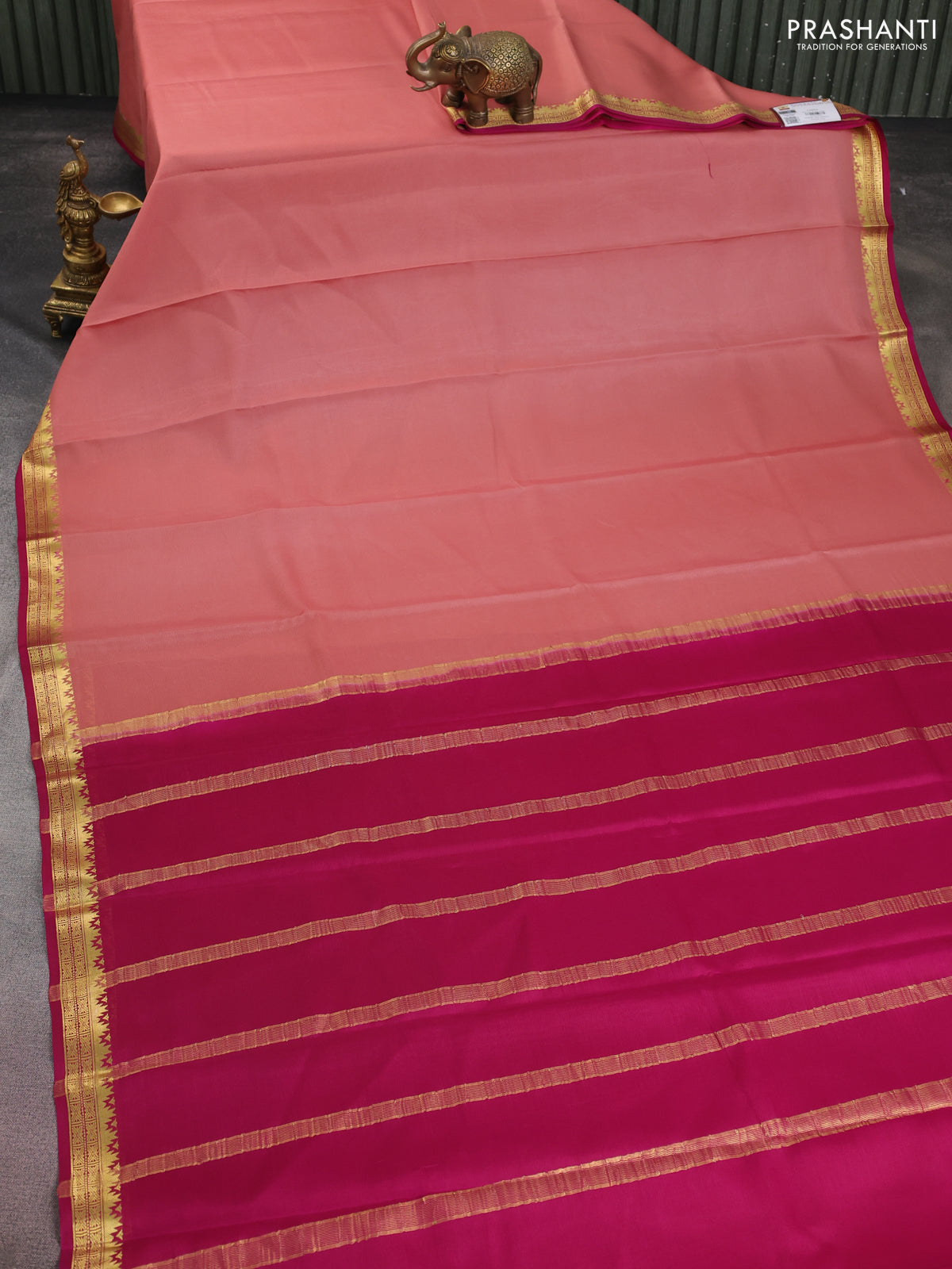 Pure mysore silk saree pastel peach and pink with plain body and zari woven border