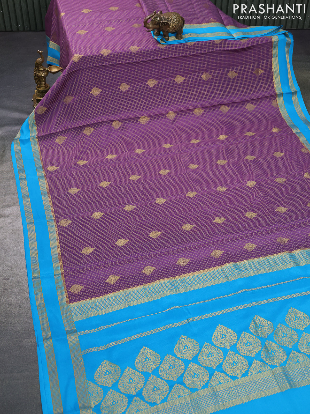 Pure mysore silk saree pastel purple and cs blue with allover small zari checks & buttas and rettapet zari woven border