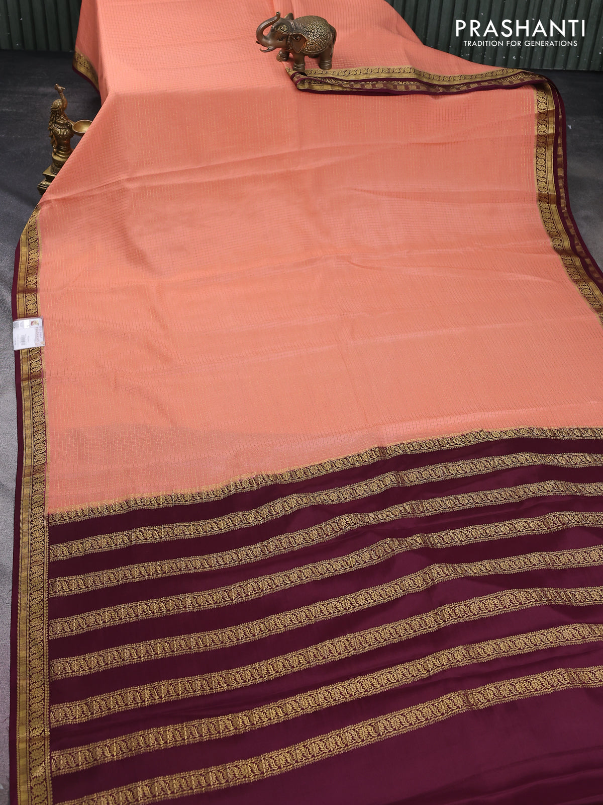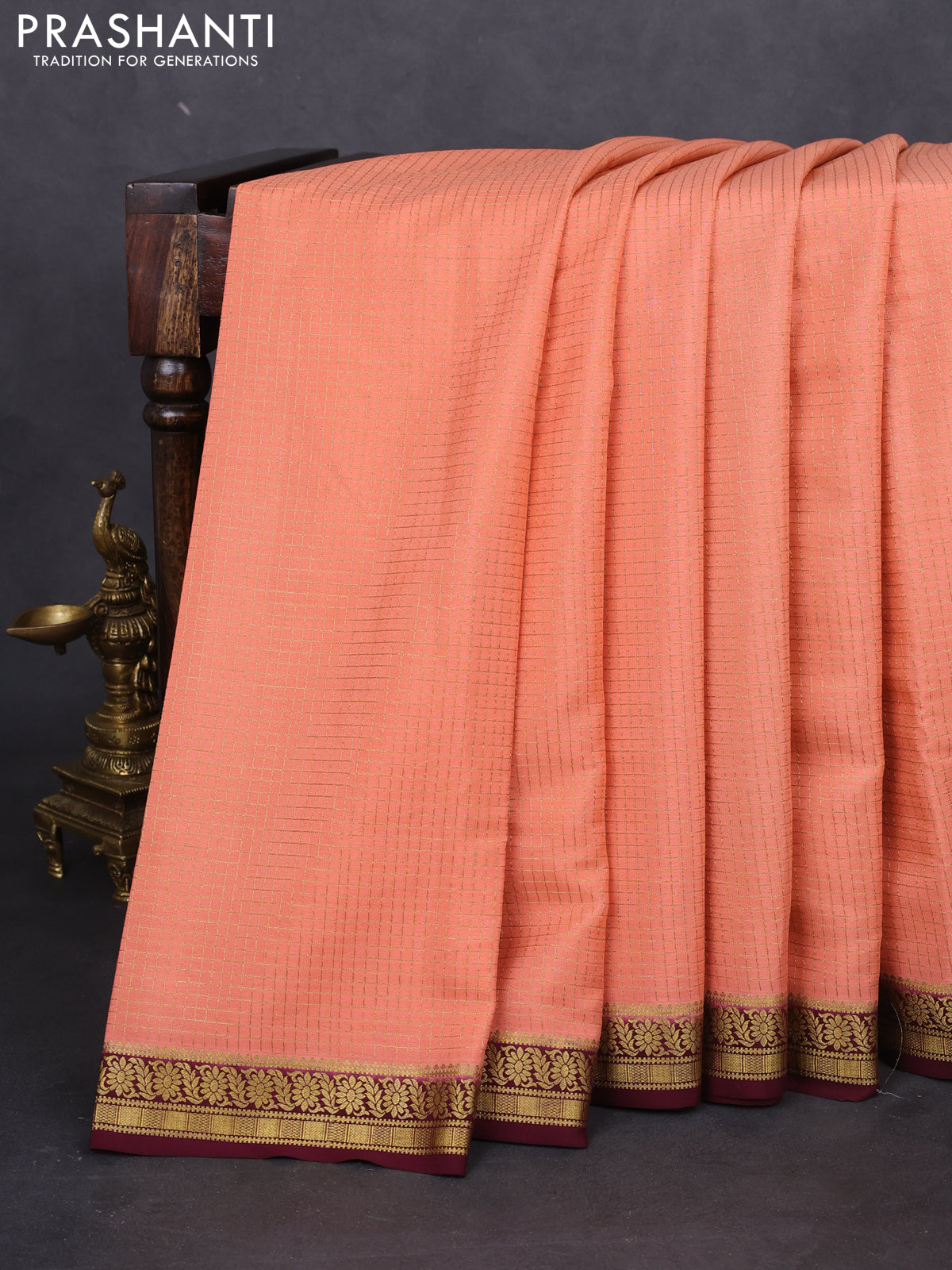 Pure mysore silk saree peach shade and wine shade with allover small zari checked pattern and zari woven border