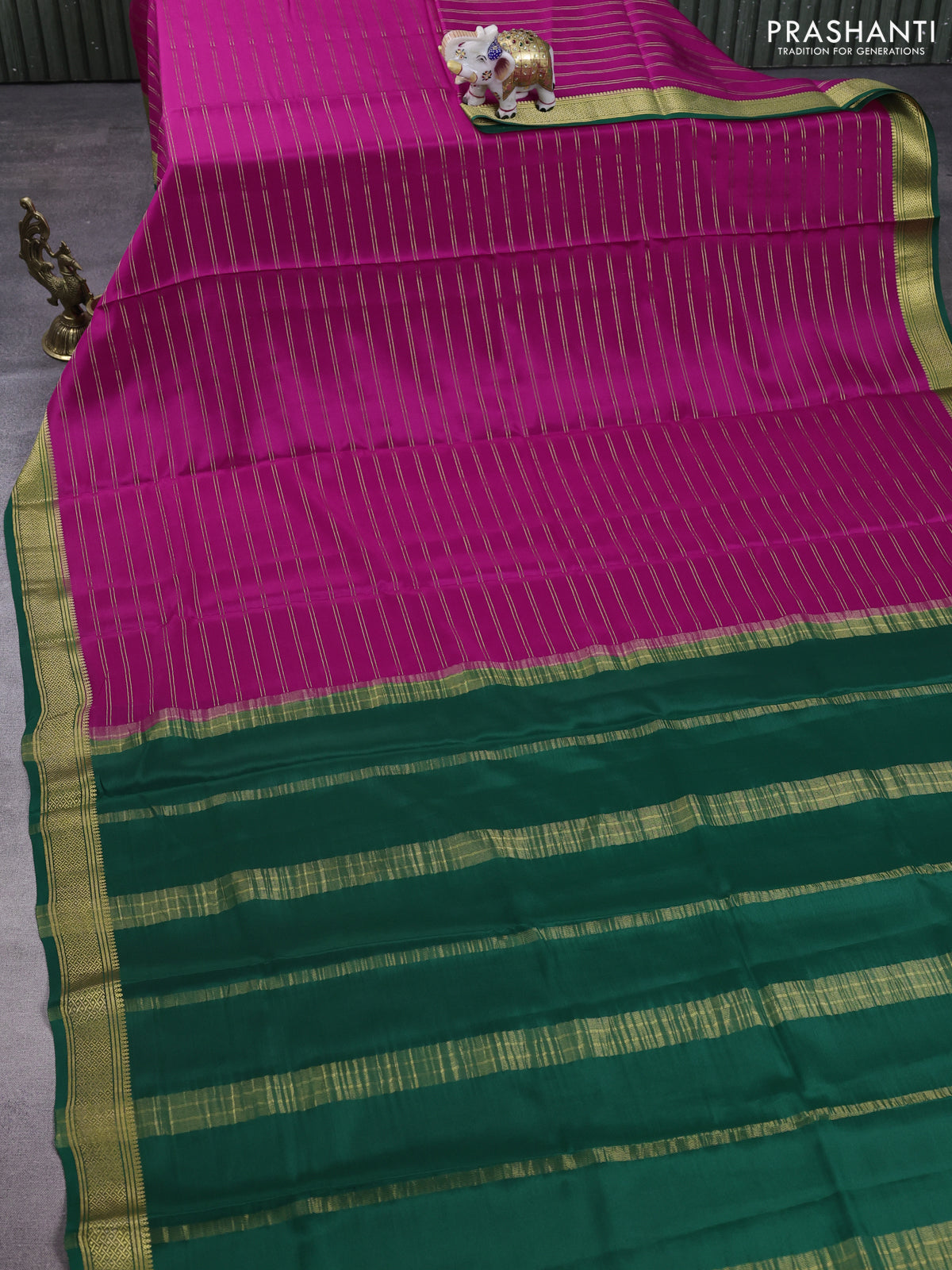 Pure mysore silk saree pink and green with allover stripes pattern and zari woven border