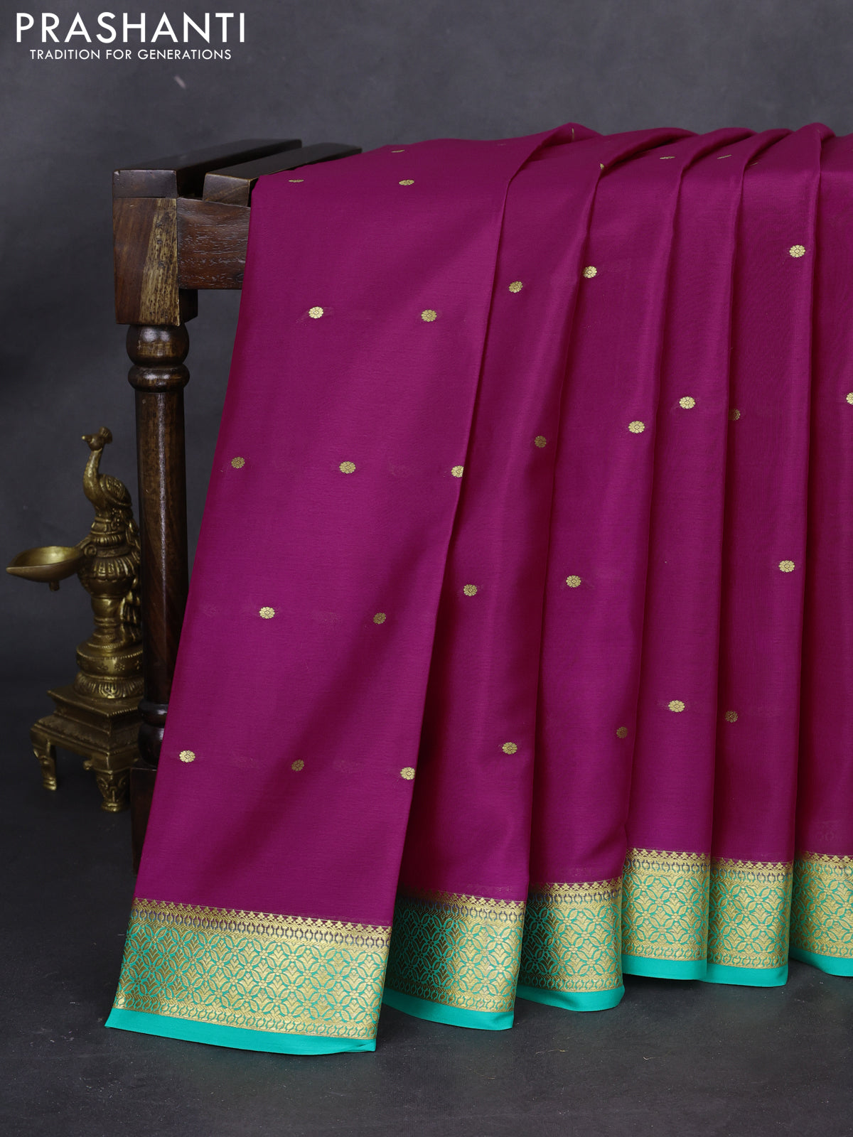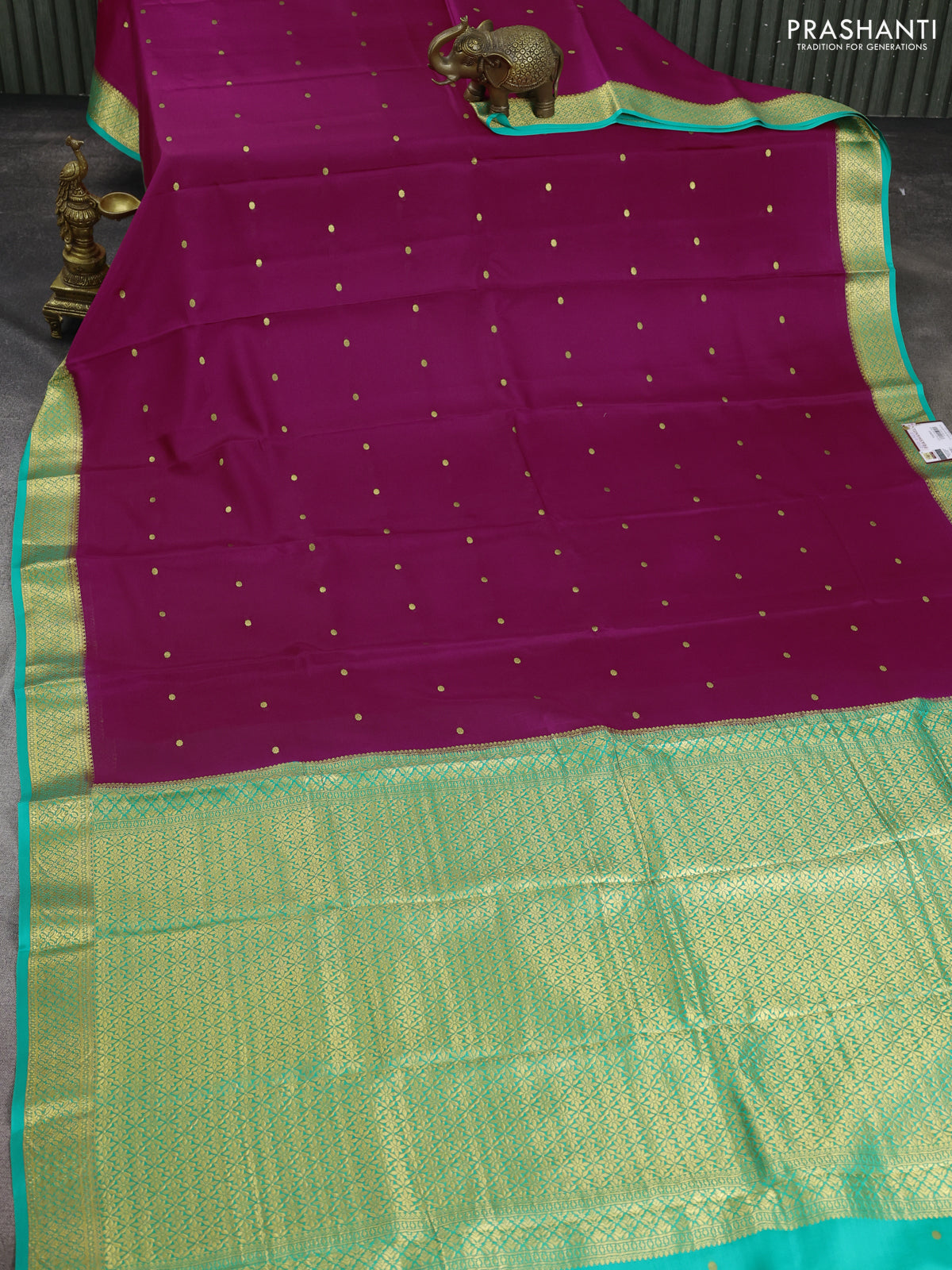 Pure mysore silk saree pink and teal green with zari woven buttas and zari woven border