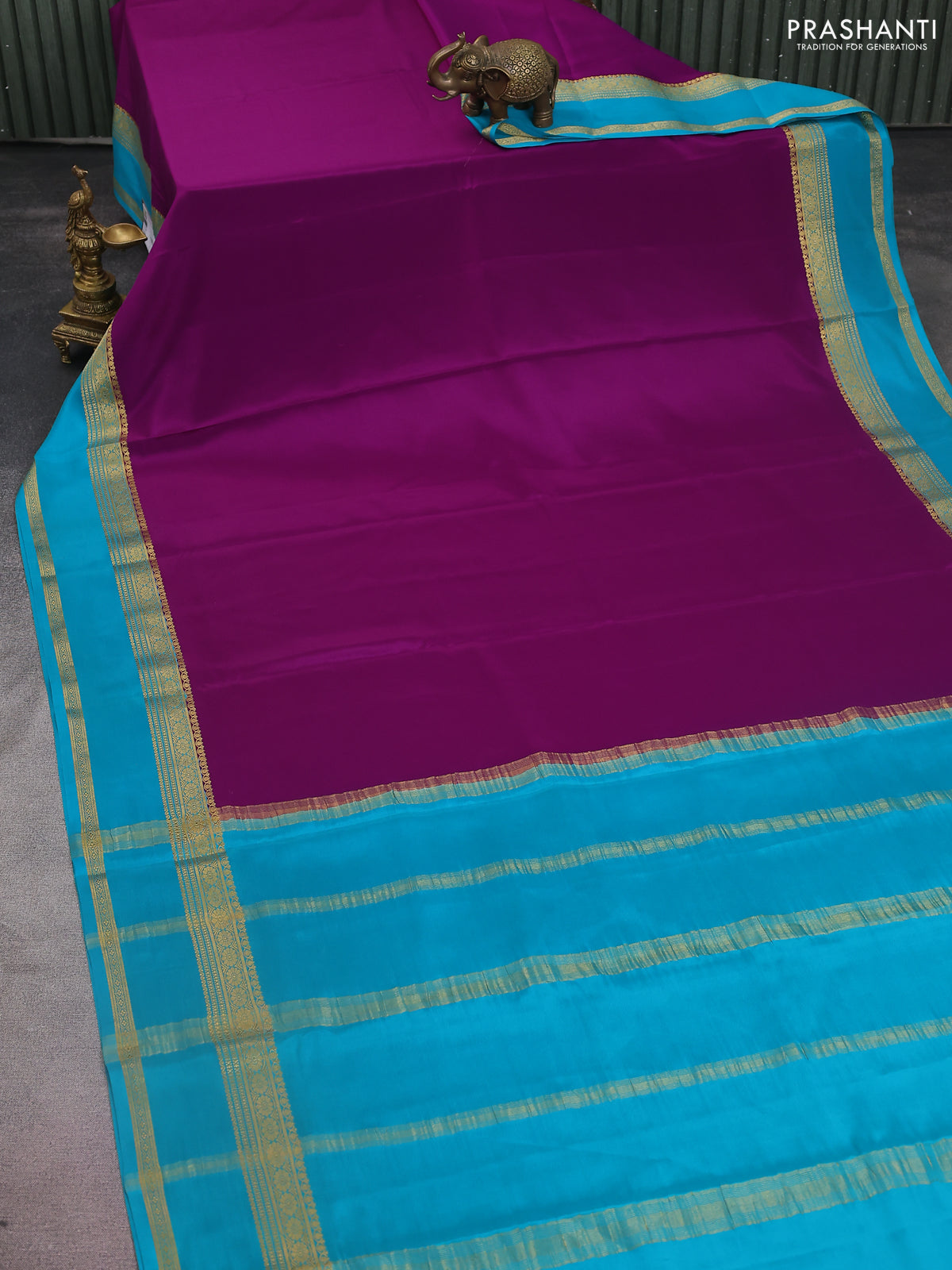 Pure mysore silk saree purple and teal blue with palin body and rettapet zari woven border