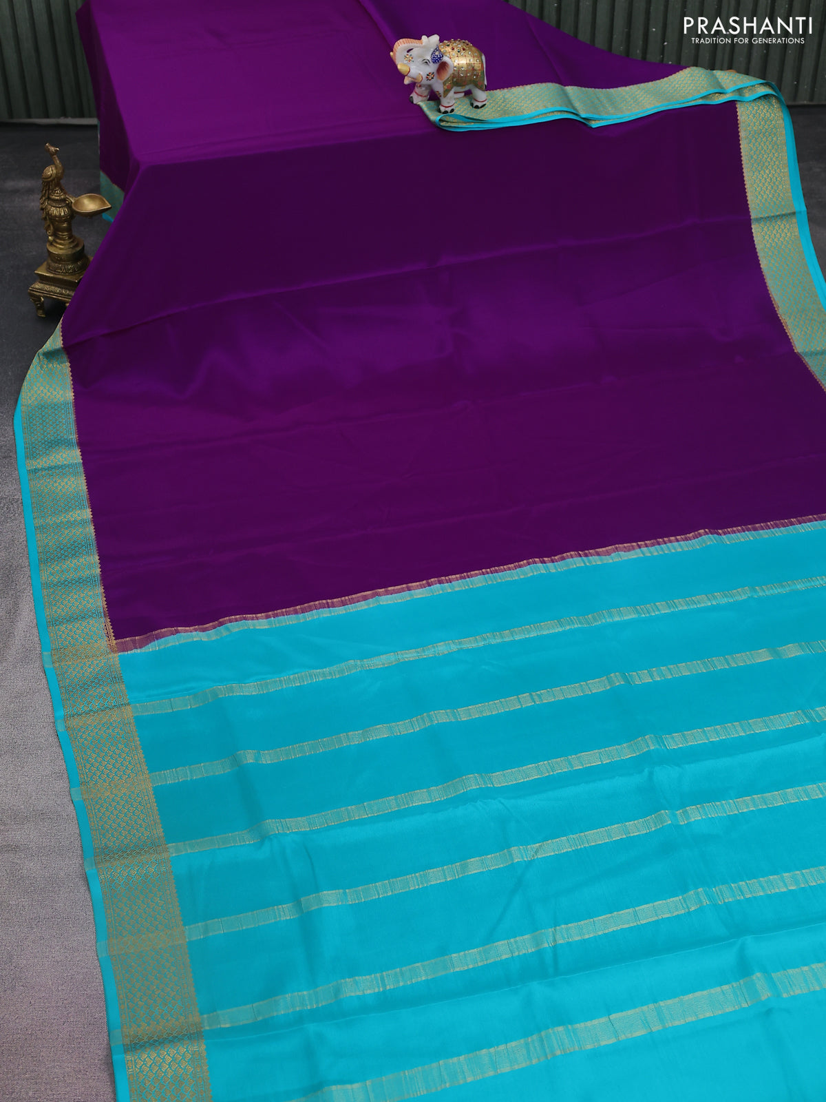 Pure mysore silk saree purple and teal blue with palin body and zari woven border