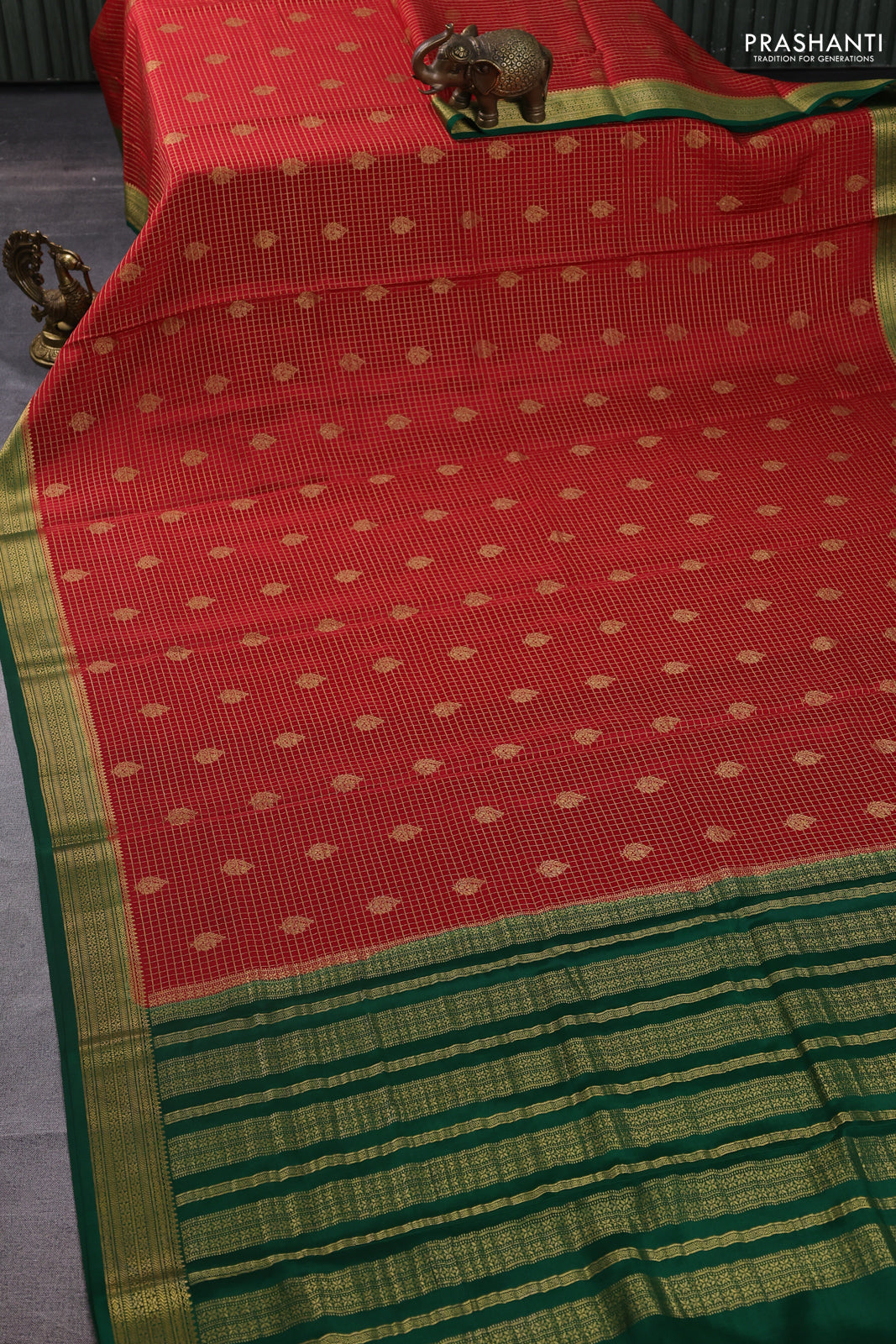 Pure mysore silk saree red and green with allover small zari checks & buttas and zari woven border