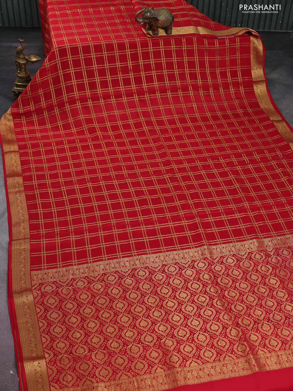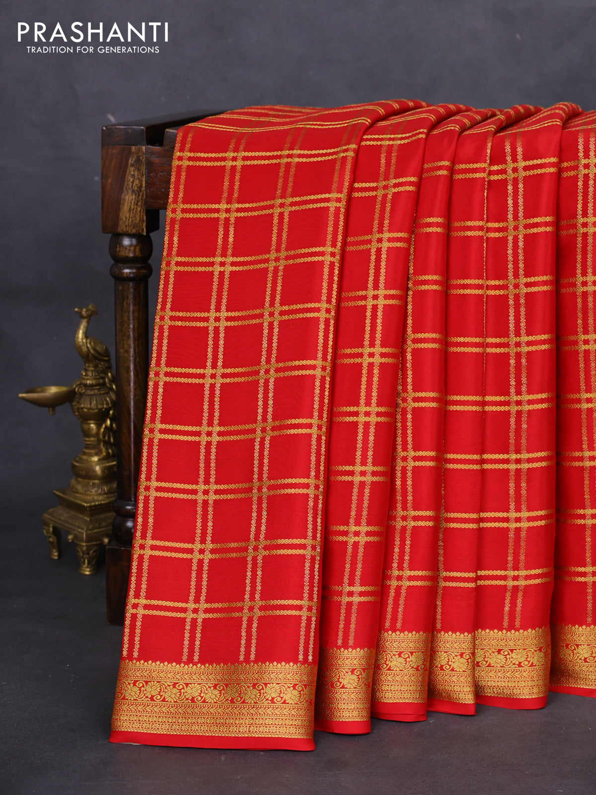 Pure mysore silk saree red with allover zari checked pattern and zari woven border