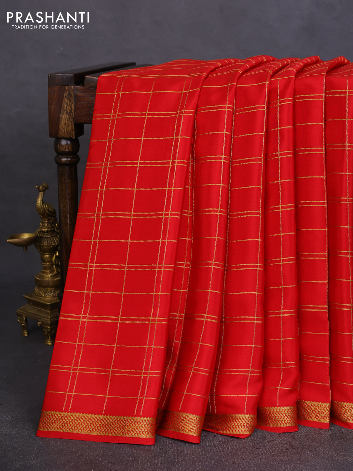Pure mysore silk saree red with allover zari checked pattern and zari woven border