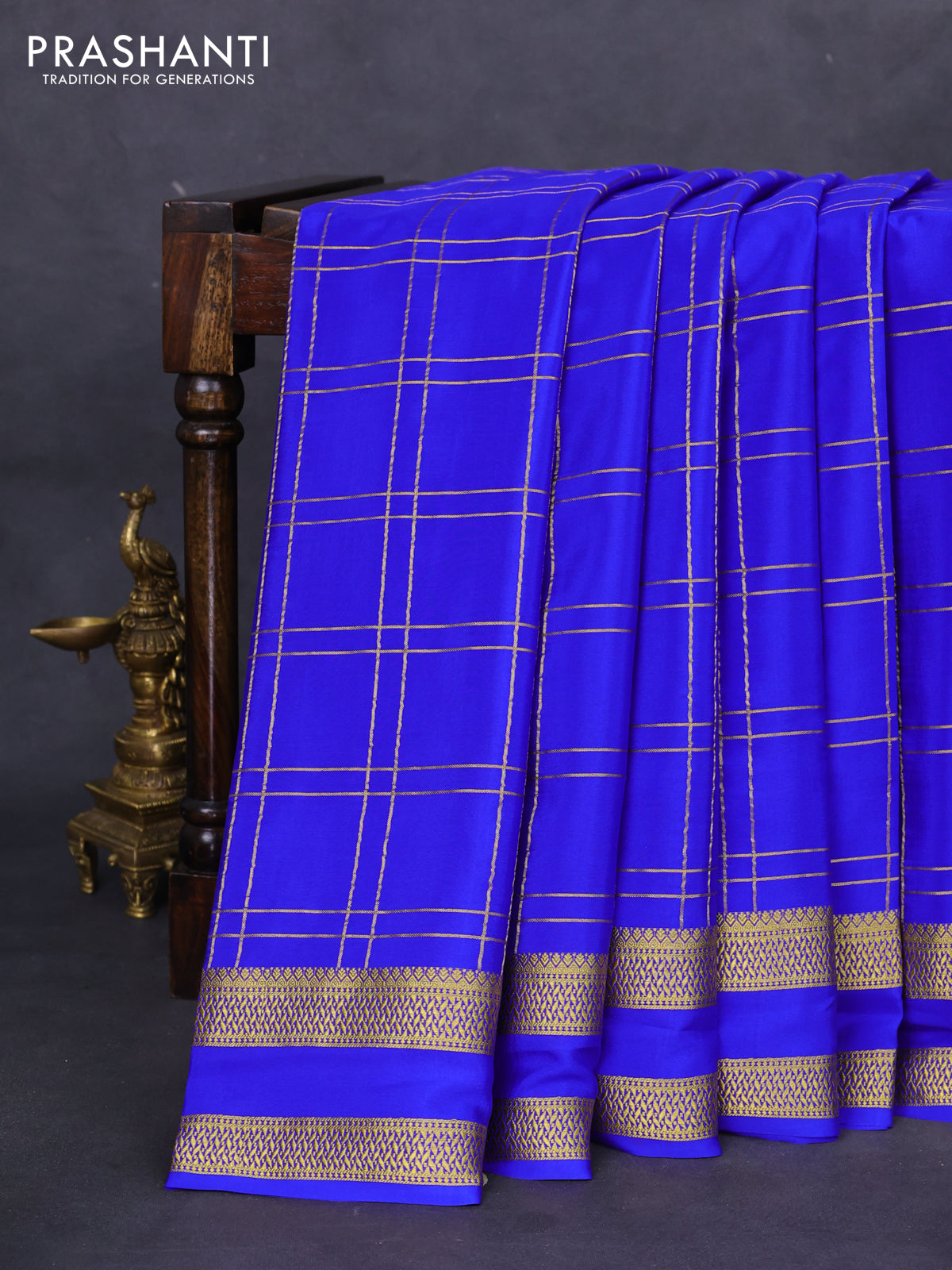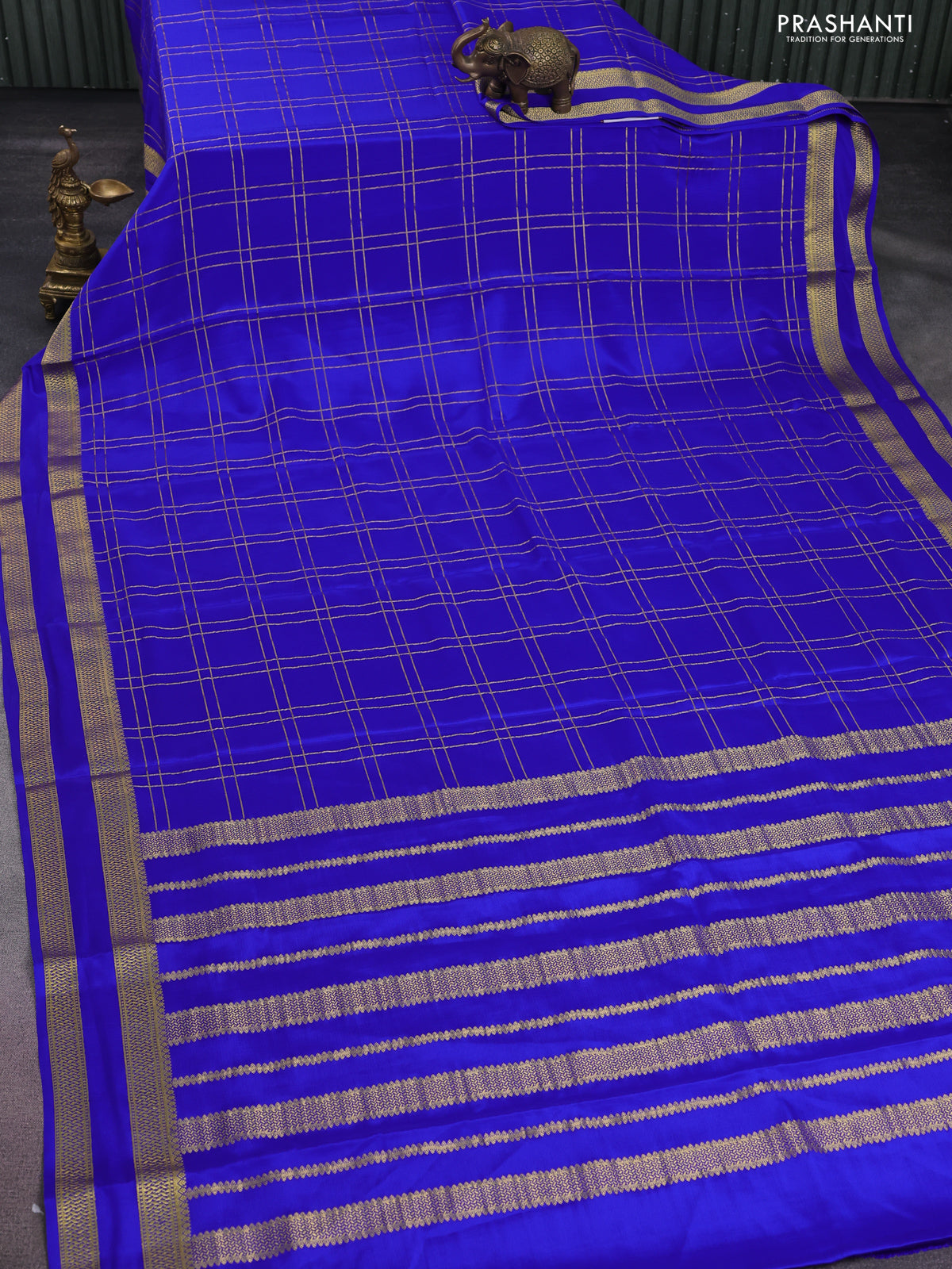 Pure mysore silk saree royal blue with allover zari checked pattern and rettapet zari woven border