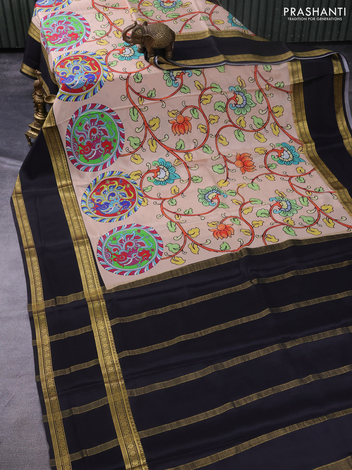 Pure mysore silk saree sandal and black with allover kalamkari prints and rettapet zari woven border