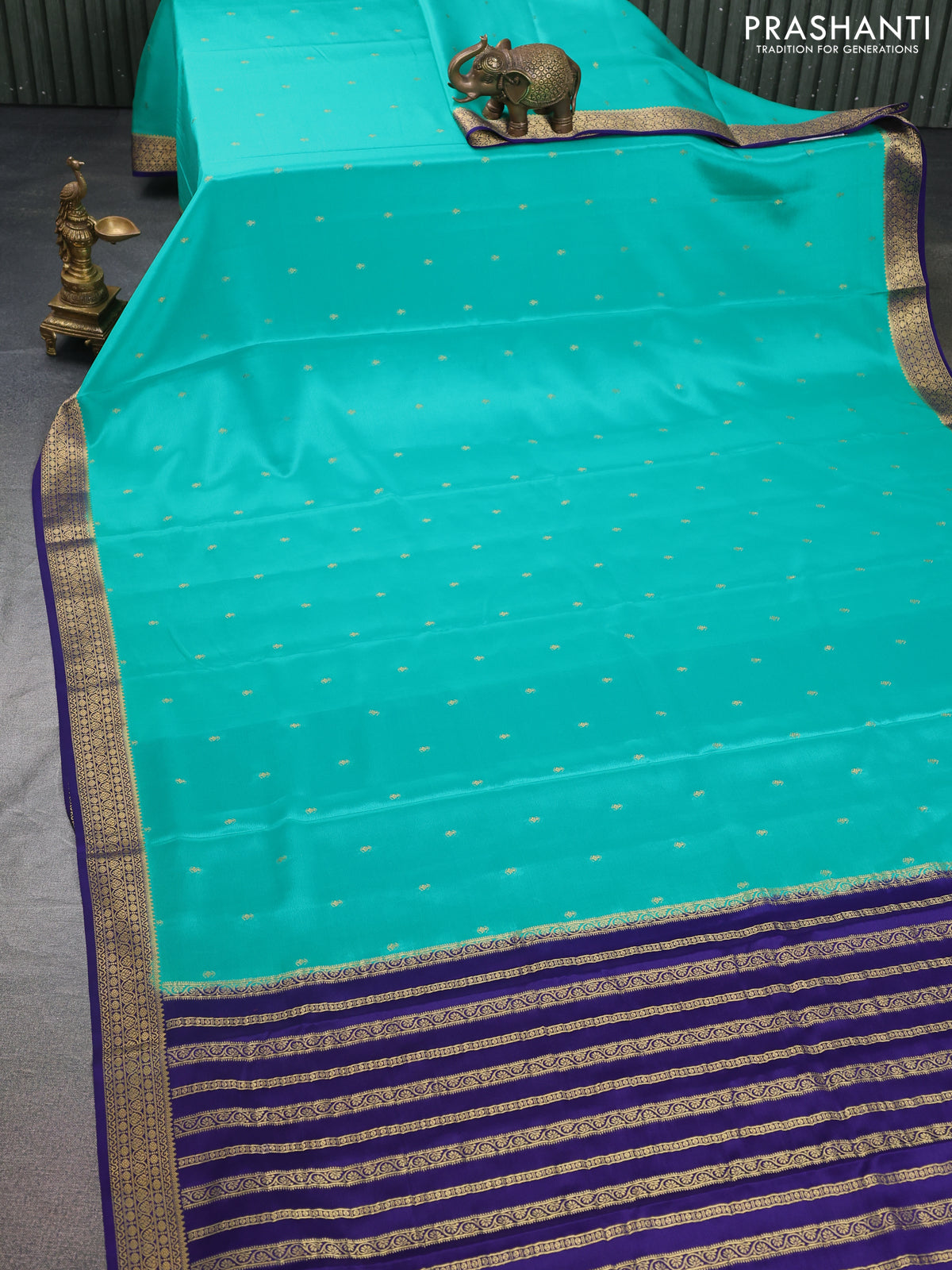 Pure mysore silk saree teal green and dark blue with allover zari woven buttas and zari woven border