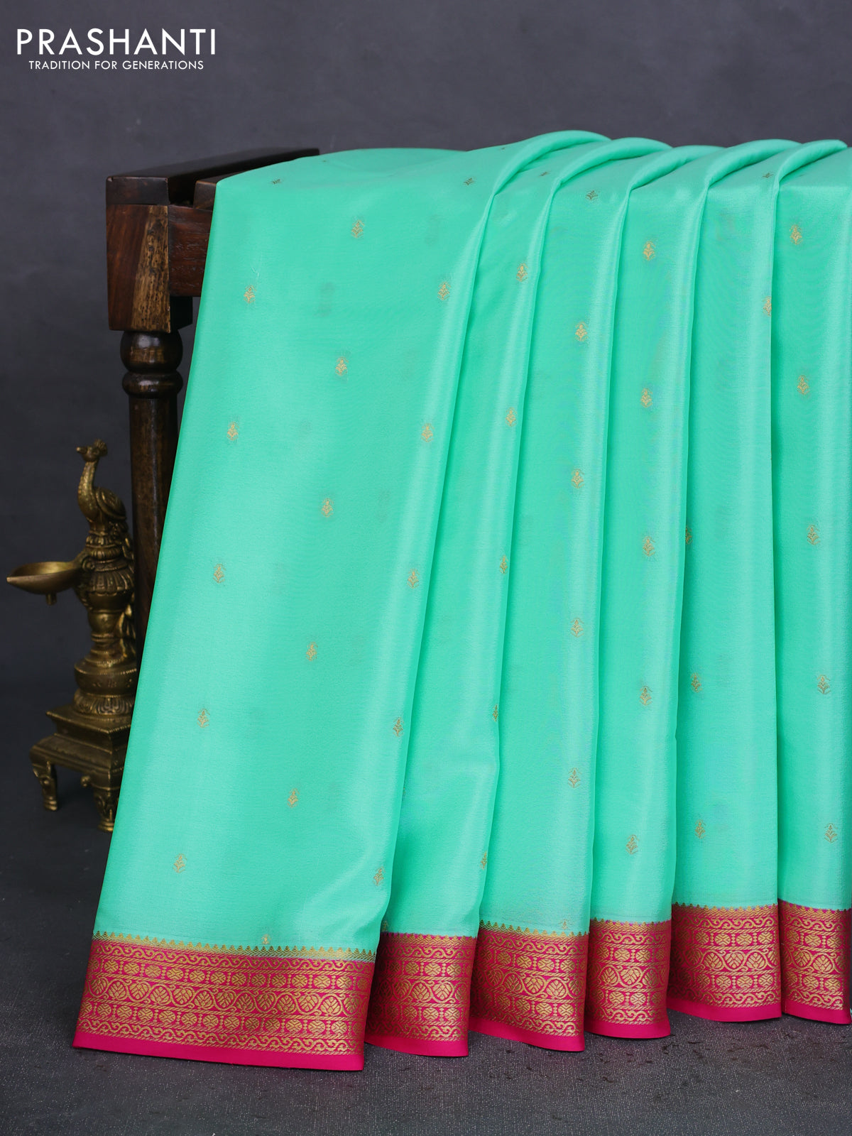 Pure mysore silk saree teal green and pink with allover zari woven buttas and zari woven border