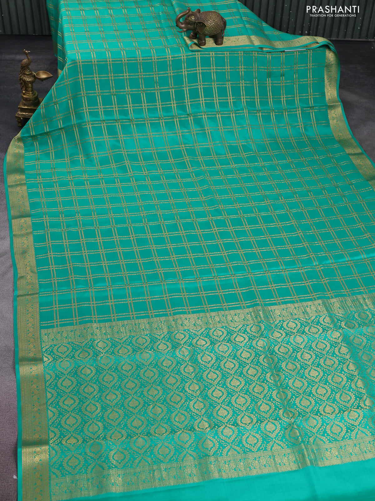 Pure mysore silk saree teal green with allover zari checked pattern and zari woven border