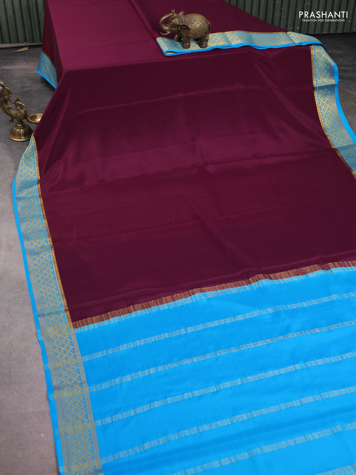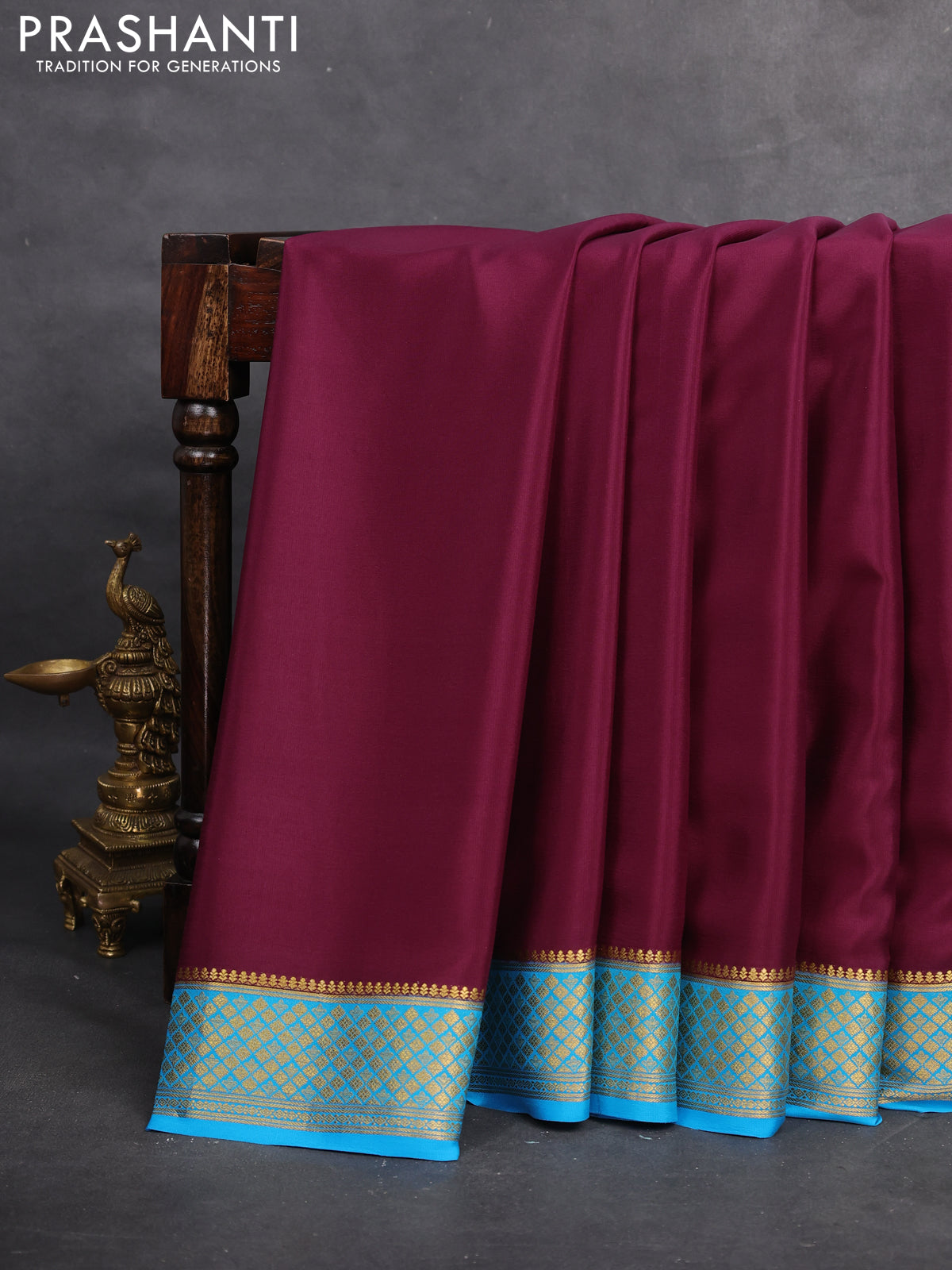 Pure mysore silk saree wine shade and cs blue with plain body and zari woven border
