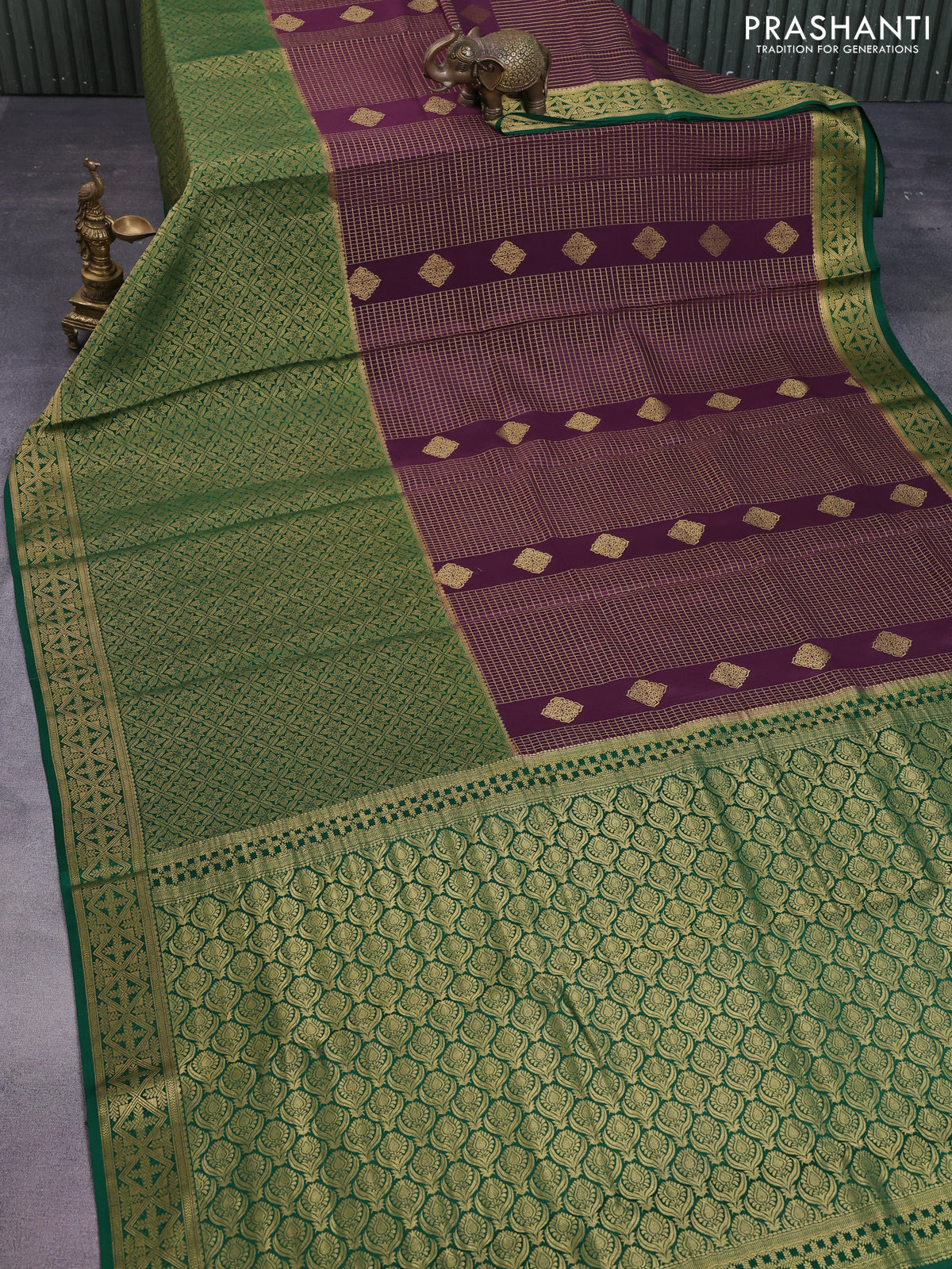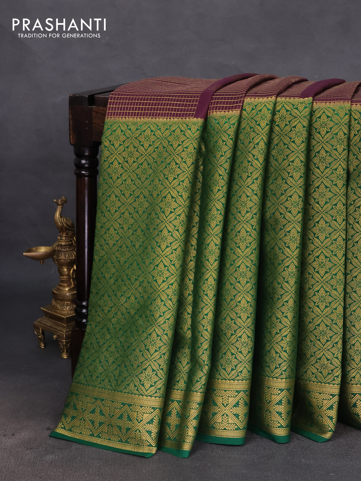Pure mysore silk saree wine shade and green with allover small zari checks and long zari woven border