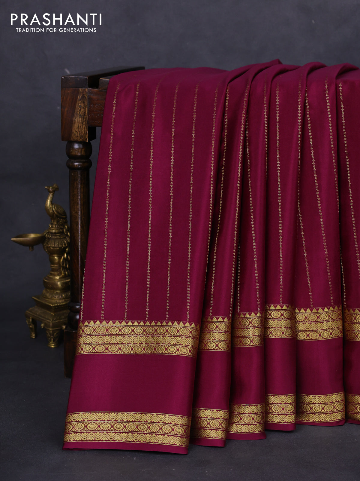Pure mysore silk saree wine shade with allover zari stripes pattern and rettapet zari woven border